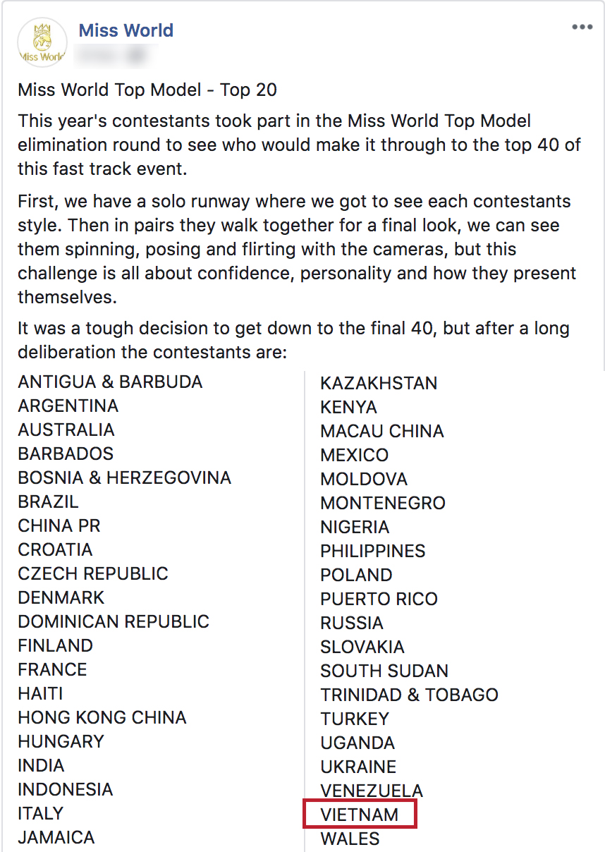 Xuất phát chậm đến với Miss World 2019 nhưng không vì thế Lương Thùy Linh cảm thấy áp lực về tinh thần, ngược lại người đẹp bước vào đấu trường nhan sắc quốc tế với phong độ vô cùng ổn định. Mới đây, Fanpage Hoa hậu Thế giới vừa công bố Top 40 thí sinh Top Model của cuộc thi năm nay và đại diện Việt Nam xuất sắc vượt qua 80 người đẹp khác để có tên trong danh sách này.