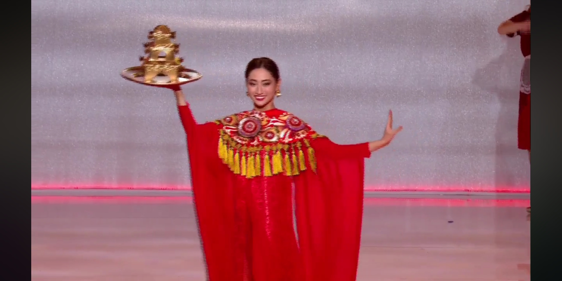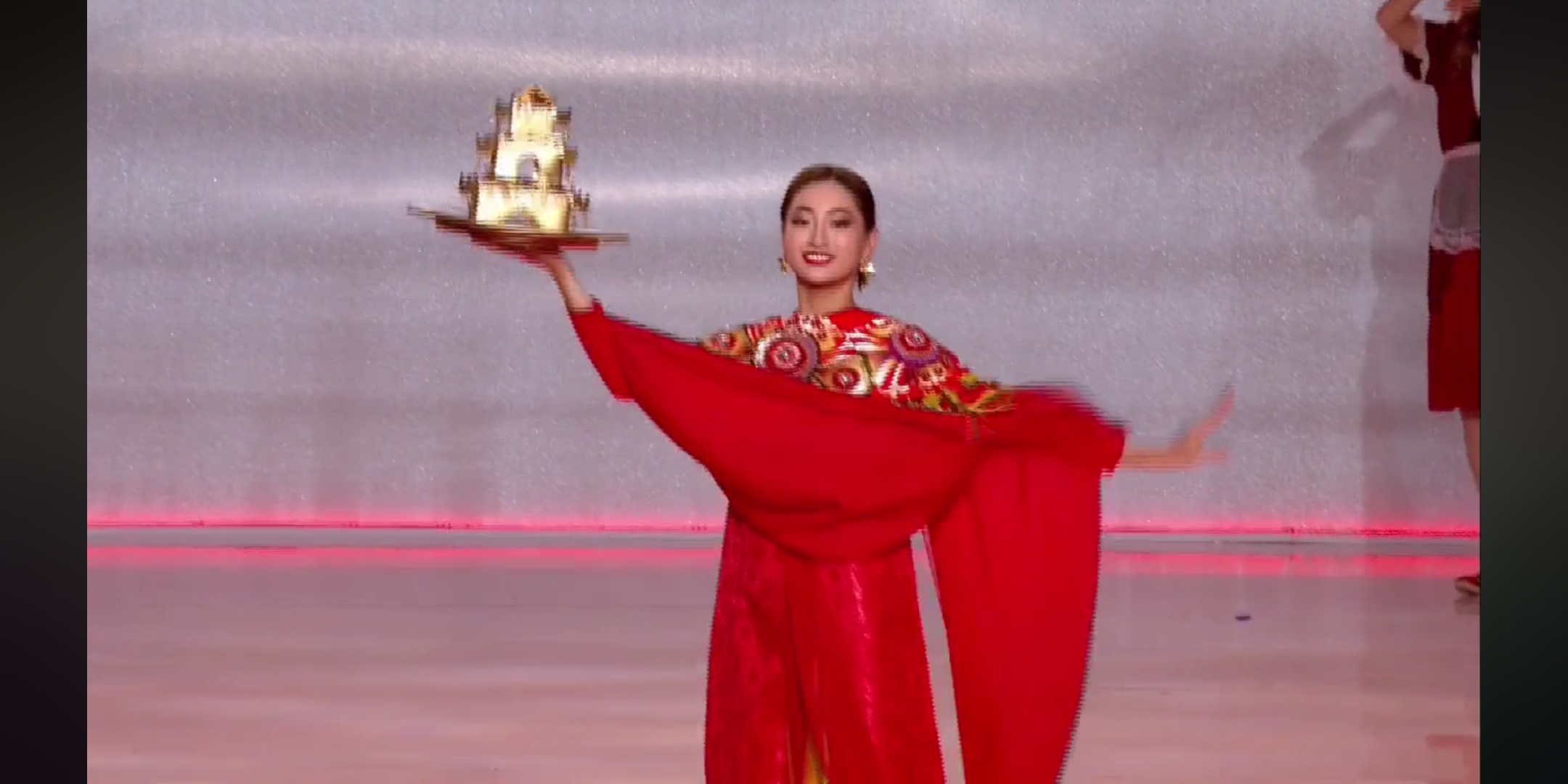 Xuất hiện nổi bật trên sân khấu Chung kết Hoa hậu Thế giới - Miss World 2019, Lương Thùy Linh “đỏ rực rỡ” trong thiết kế trang phục mang đậm dấu ấn văn hóa của dân tộc. Đại diện Việt Nam hòa mình vào tiết mục đồng diễn Dances of the world cùng với 110 người đẹp đến từ nhiều quốc gia và vùng lãnh thổ.