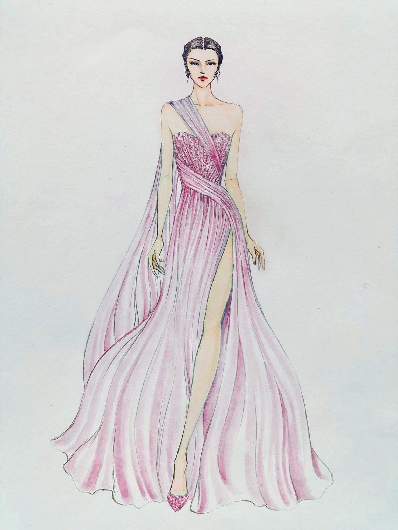 Hai bộ váy có phom dáng giống nhau nhưng chỉ khác màu sắc. Một bộ màu hồng xanh dương vô cùng trang nhã và một bộ màu hồng pastel yêu kiều thướt tha. Thiết kế cúp ngực cùng họa tiết phần tà lệch vai để tôn lên bờ vai đẹp của cô gái sinh năm 2000 bên cạnh đó triệt để xẻ đùi cao ngút ngàn giúp Lương Thùy Linh phô trọn đôi chân dài 1m22 của mình. Phần tà váy bay bổng sẽ giúp đại diện Việt Nam dễ dàng di chuyển khi sải bước trên sân khấu. Cả tông màu hồng và tông màu xanh dương này đều là 2 gam màu tủ của Lương Thùy Linh thường xuyên ưu ái lựa chọn trong suốt hành trình Miss World 2019, đồng thời đây cũng là 2 tông màu chủ đạo - tông màu phong thủy tại sân chơi Hoa hậu Thế giới.
