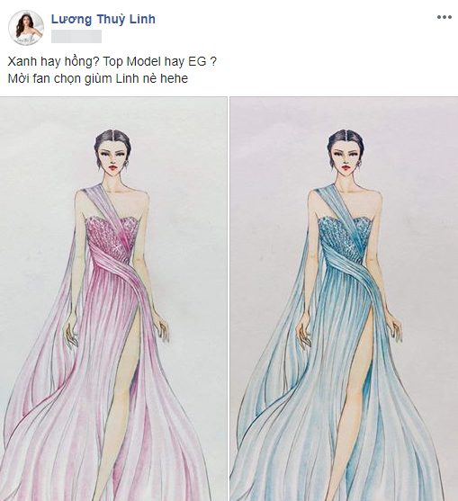 Sau chuỗi ngày chinh chiến tại Miss World 2019 để bước vào phần thi quan trọng Top Model cũng như đêm chung kết, Lương Thùy Linh đã ra sức nhờ fan tư vấn giúp 2 bộ váy với 2 tông màu khác nhau nhưng chung phom dáng: Hồng pastel yêu kiều và bộ xanh dương trang nhã.