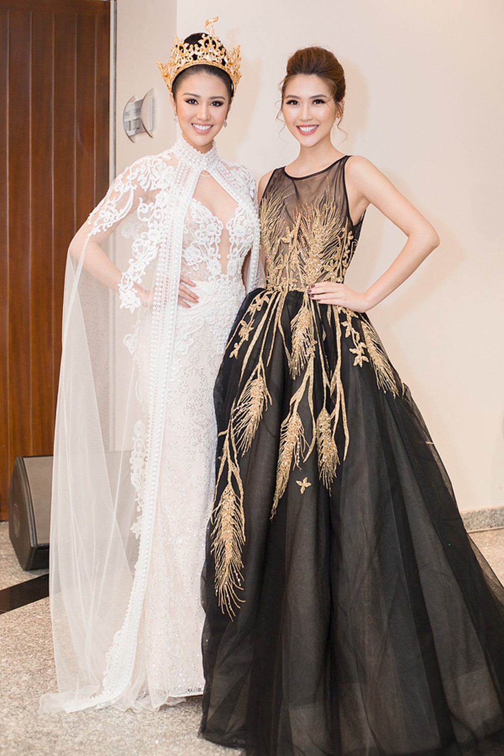 Không hổ danh là nữ hoàng thảm đỏ, Huyền My chưa bao giờ làm fan Việt thất vọng mỗi khi xuất hiện. Trong khung hình chụp chung với Hoa hậu Hòa bình Quốc tế 2016, Huyền My vẫn cực kì xinh xắn với lối trang điểm trong suốt.