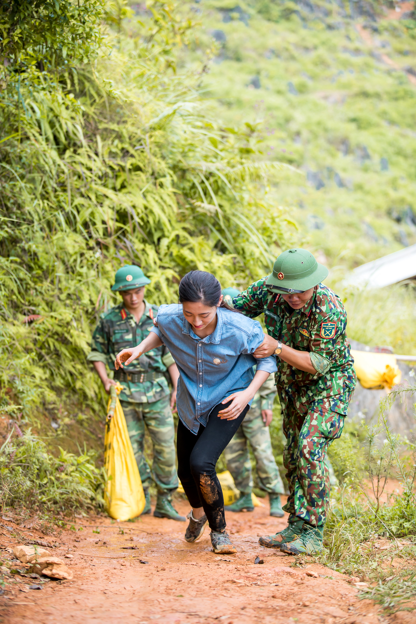 Tuy nhiên, do trời đổ mưa khiến đường trơn trợt, người đẹp đã té ngã khi trực tiếp tham gia quá trình thi công. Mặc cho cơn đau bất chợt, trên gương mặt hoa hậu vẫn ánh niềm vui sướng và hạnh phúc vì có được cơ hội chung sức làm nên những điều ý nghĩa cho cộng đồng. Người đẹp thể hiện rõ sự quyết tâm khi mạnh mẽ đứng lên, tiếp tục vác đá hăng say.