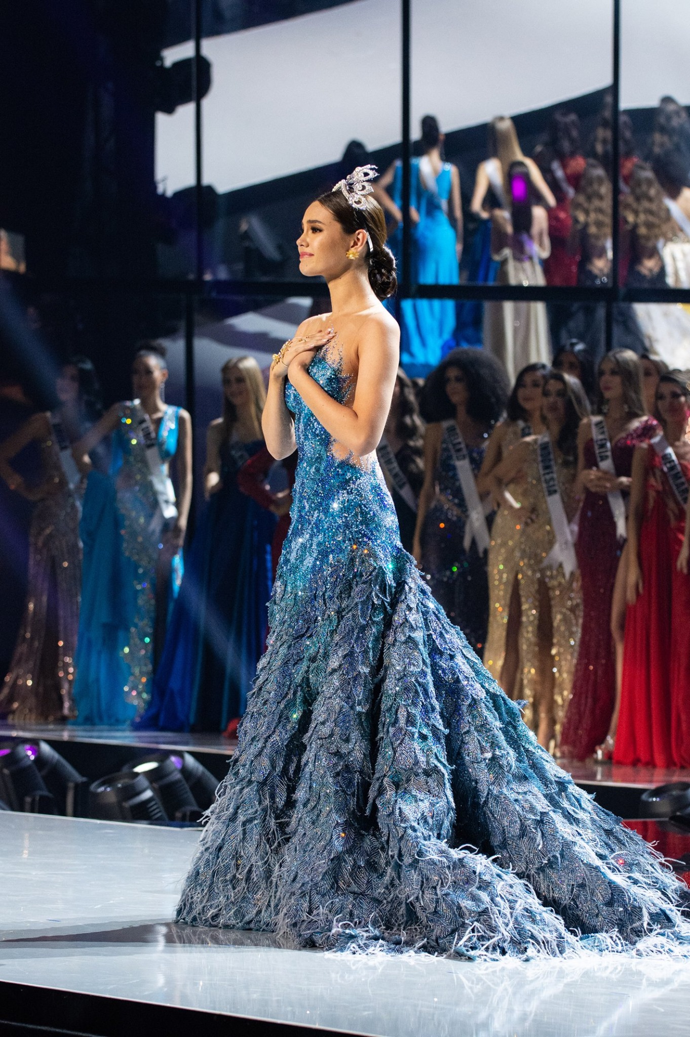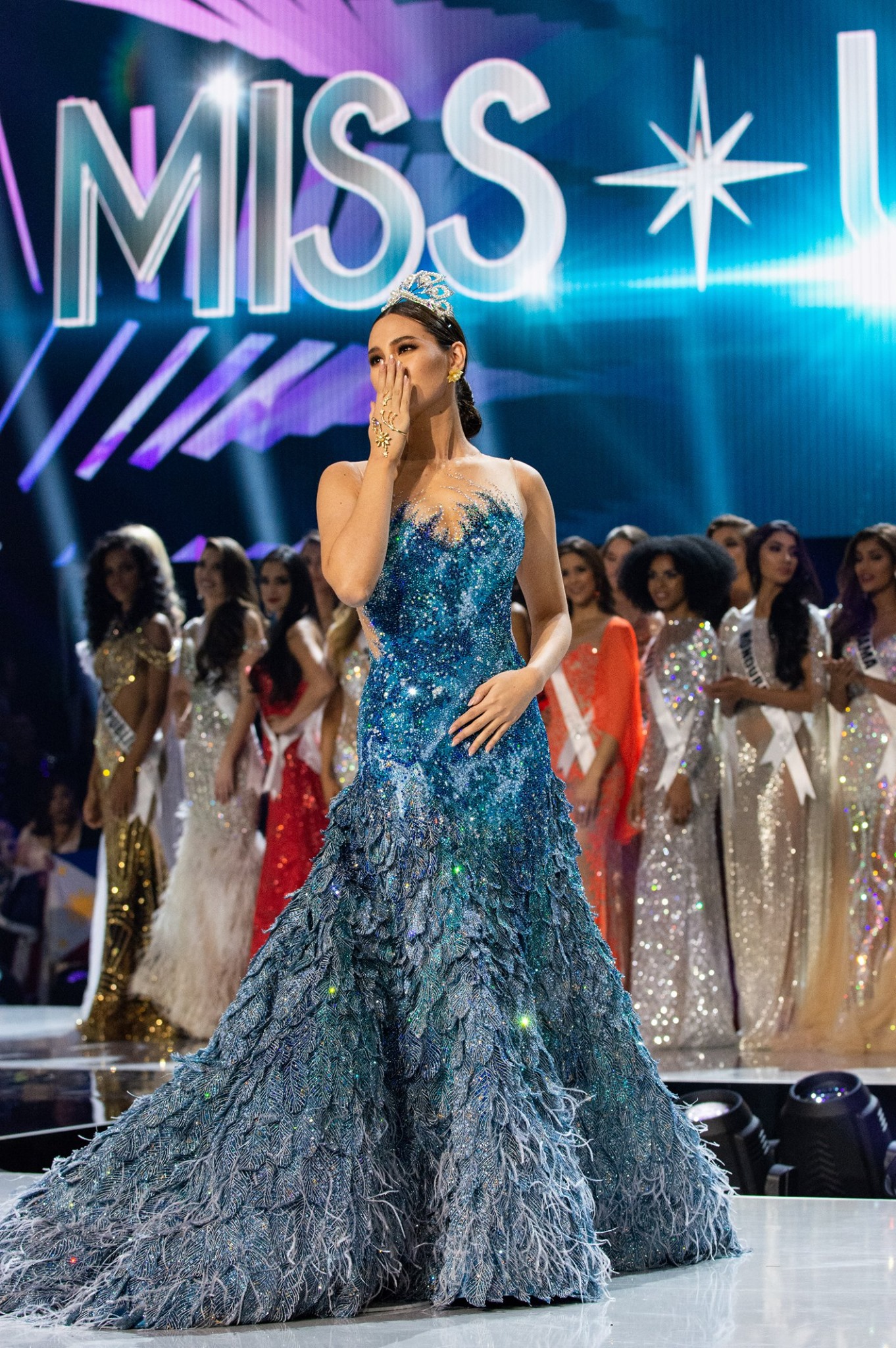 Xuất hiện trong đêm Chung kết Miss Universe 2019 với bộ đầm dạ hội xanh được thiết kế cầu kì và chiếc vương miện được chỉnh sửa nguyên vẹn, Catriona Gray - Hoa hậu Hoàn vũ 2018 đã sải những bước chân cuối cùng trong nhiệm kì của mình trước khi trao lại vương miện cho người kế nhiệm.