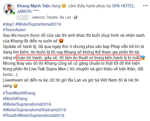 Sau 3 ngày, siêu mẫu Mạnh Khang vẫn chưa thể tìm lại được số hành lý bị thất lạc. Đây chính là lí do đại diện Việt Nam sẽ vắng mặt ở phần thi tài năng tại Mister Supranational 2019. Điều làm fan Việt lo lắng là trong số hành lí bị thất lạc có cả chiếc mũ của bộ trang phục dân tộc “Lạc Vũ” mà anh chàng mang sang Ba Lan giúp Ngọc Châu.