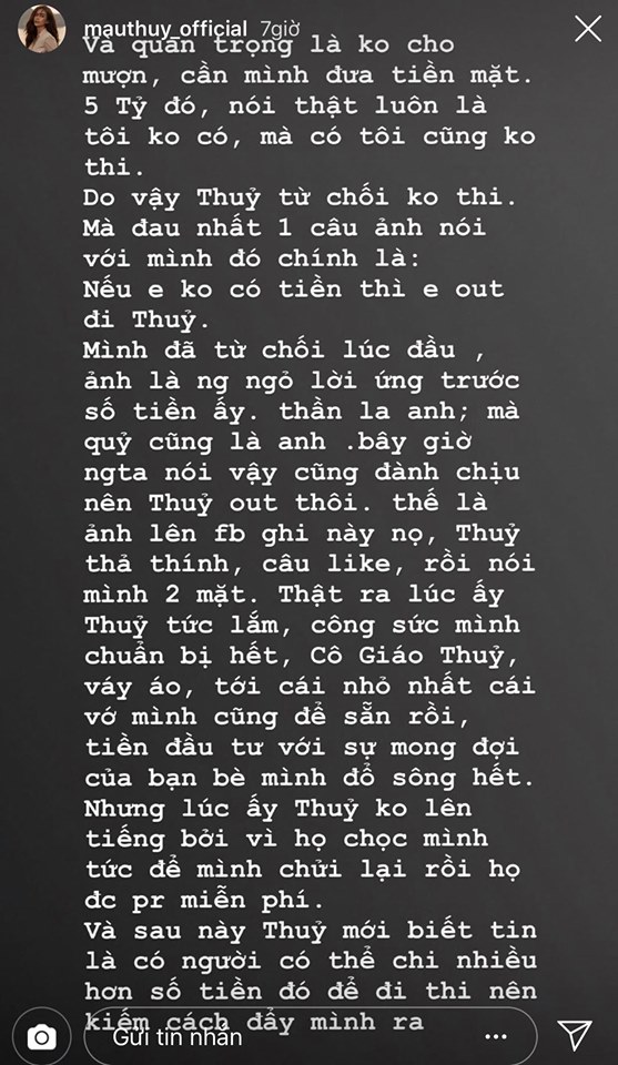 Tuy nhiên, sau đó Mâu Thủy được gọi và thông báo cần có 5 tỷ để lần đi thi đi này sẽ hoàn hảo hơn. Với số tiền lớn như vậy, Mâu Thủy đã quyết định không đi thi. Cô nàng chia sẻ: “5 tỷ đó nói thật luôn là tôi không có, mà có tôi cũng không thi. Mà đau nhất 1 câu anh ấy nói: Nếu em không có tiền thì em out đi Thủy. Mình đã từ chối ngay lúc đầu, anh ấy là người ngỏ lời cho ứn trước số tiền ấy. Bây giờ người ta nói như vậy cũng đành chịu nên Thủy out thôi”.