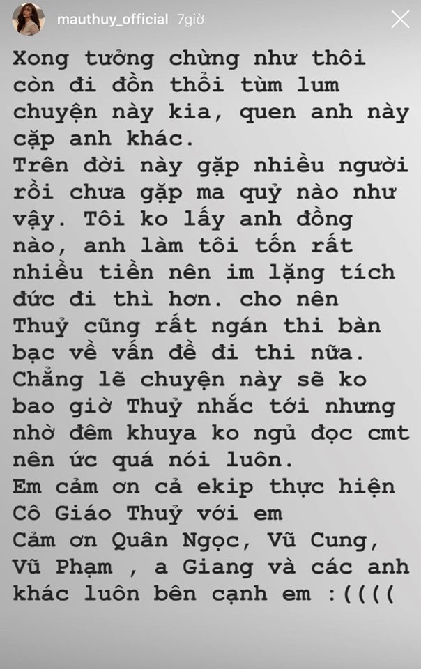 Dù buồn nhưng Mâu Thủy vẫn chọn cách im lặng vì nhiều lý do lùm xùm với Đại diện BTC tại Việt Nam, cô nàng không muốn nhắc tới. Nhưng thời gian gần đây, nhiều cư dân mạng lại khơi lại câu chuyện này và bị gán tiếng xấu, nên Mâu Thủy đã quyết định phanh phui sự thật.