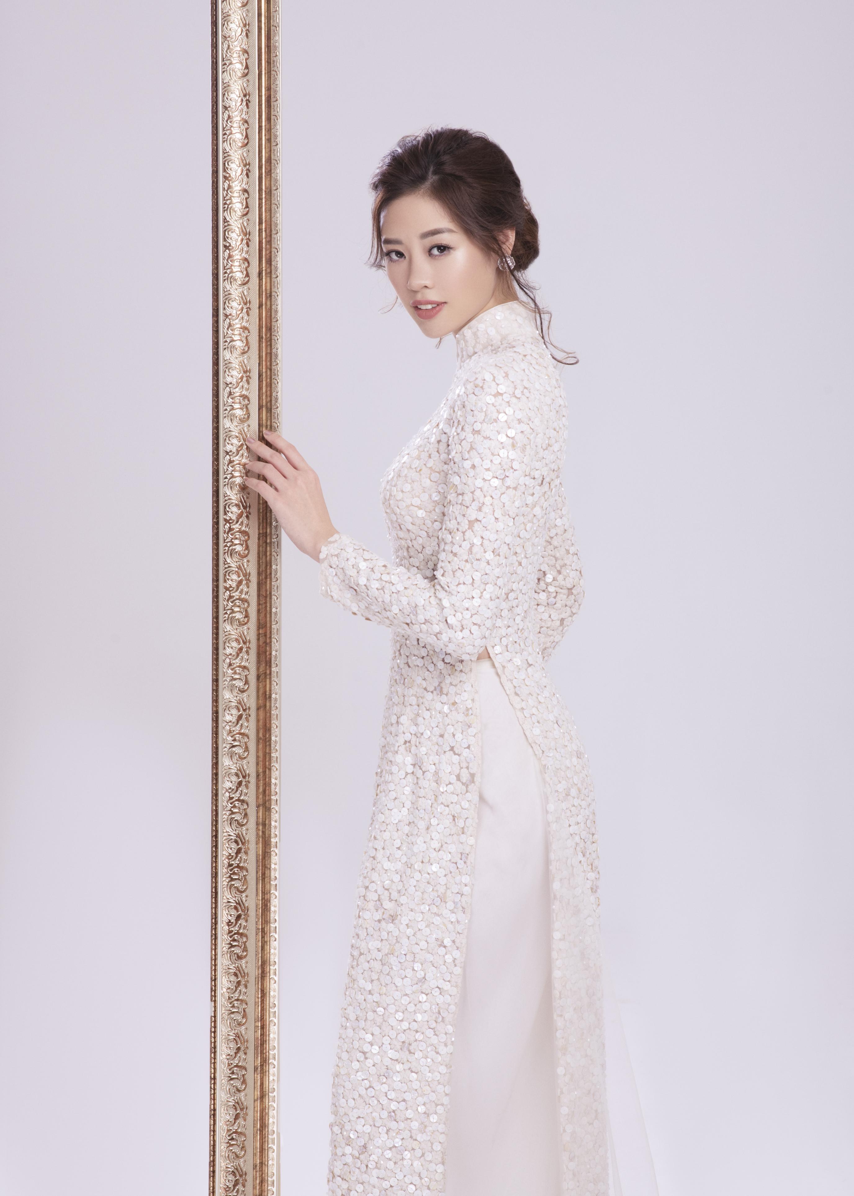 Khánh Vân đẹp dịu dàng và đằm thắm trong tà áo dài màu trắng tinh khôi.