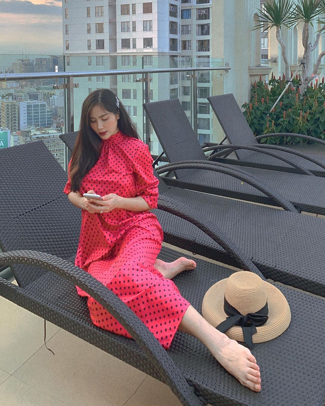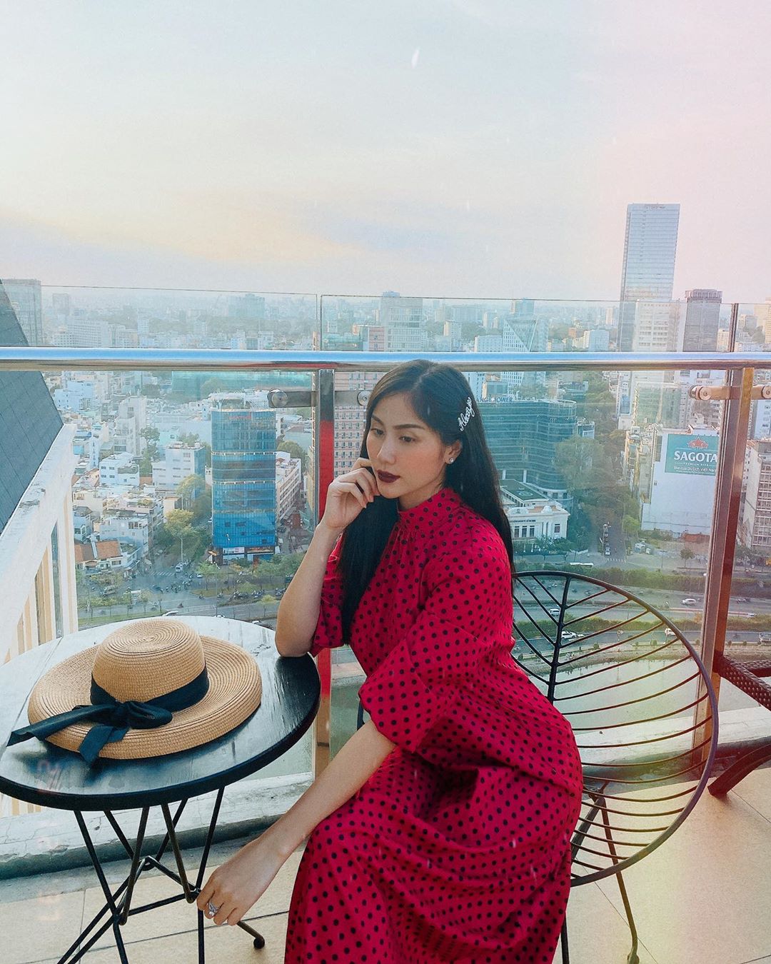 Á hậu Hoàng Hạnh diện váy chấm bi đỏ sặc sỡ cuốn hút fan.