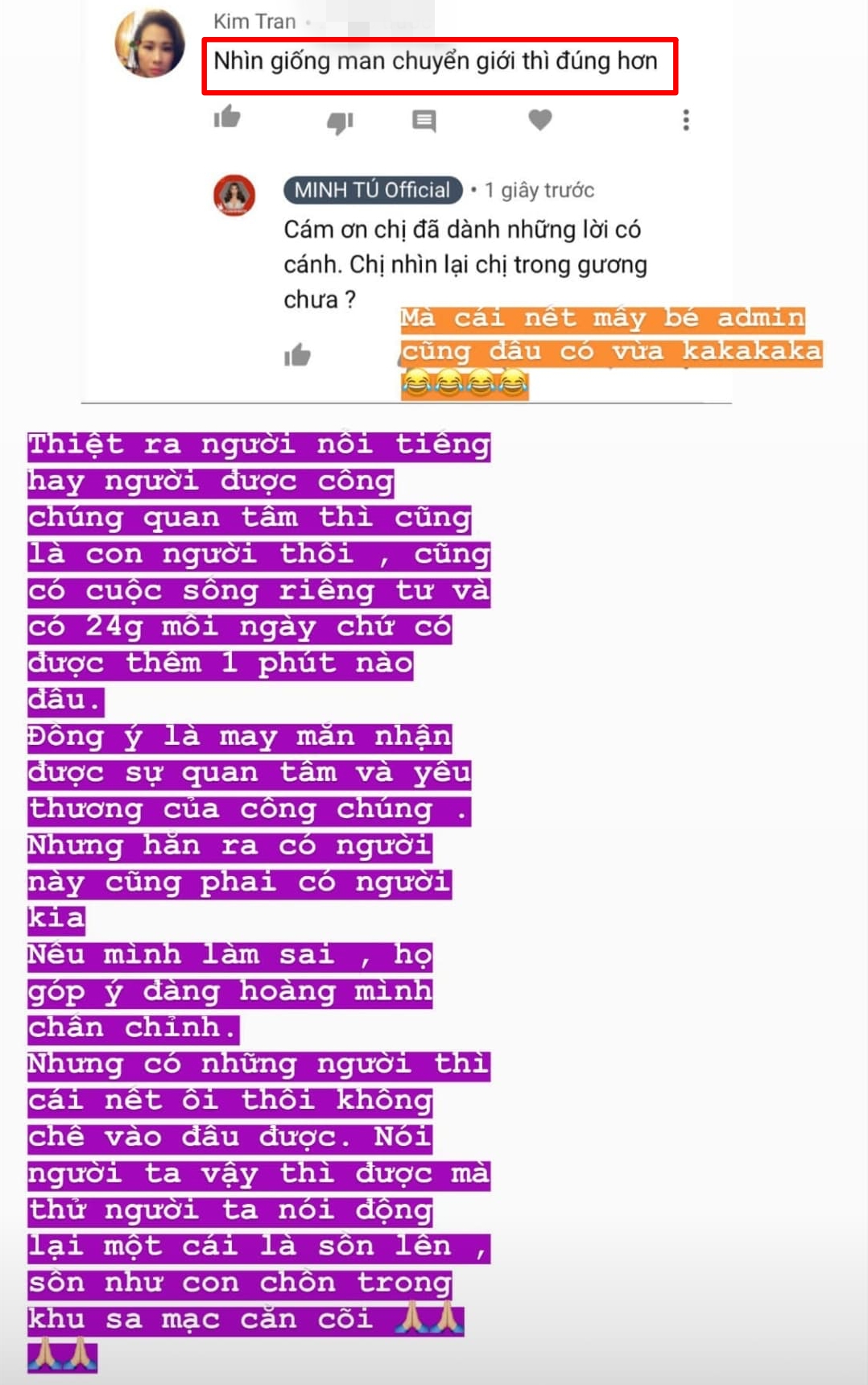 Chưa đợi Minh Tú lên tiếng, ê-kíp của cô nàng đã nhanh chóng đáp trả: “Cám ơn chị đã dành những lời có cánh. Chị nhìn lại chị trong gương chưa?”. Là người trực tiếp được nhắc đến, chân dài 1992 chia sẻ: “Thiệt ra người nổi tiếng hay người được công chúng quan tâm thì cũng là con người thôi. Họ có cuộc sống riêng tư và 24 giờ mỗi ngày, có được thêm một phút nào đâu.