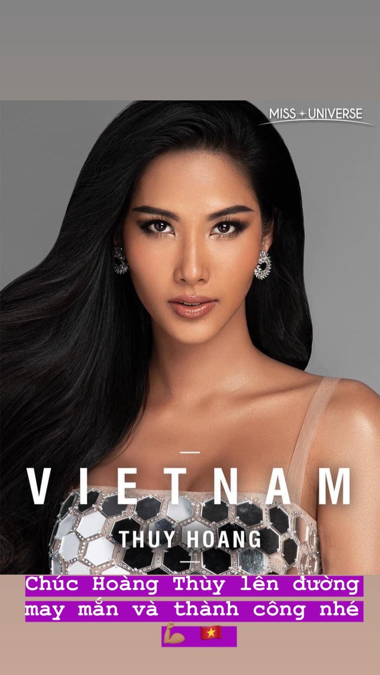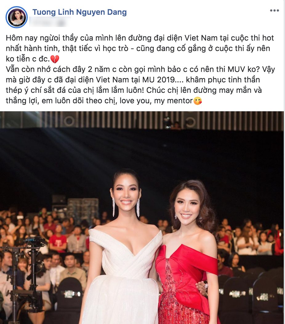 Vì vướng lịch trình dự thi Miss Universe Vietnam 2019 nên Tường Linh chỉ có thể dành những lời tình cảm nhất cho Hoàng Thùy: “Vẫn còn nhớ cách đây 2 năm chị gọi hỏi mình rằng chị có nên thi Hoa hậu Hoàn vũ không? Vậy mà giờ đây chị đã đại diện Việt Nam tại Miss Universe 2019. Em khâm phục tinh thần thép, ý chí sắt đá của chị. Chúc chị lên đường may mắn và thắng lợi, em luôn dõi theo chị”.
