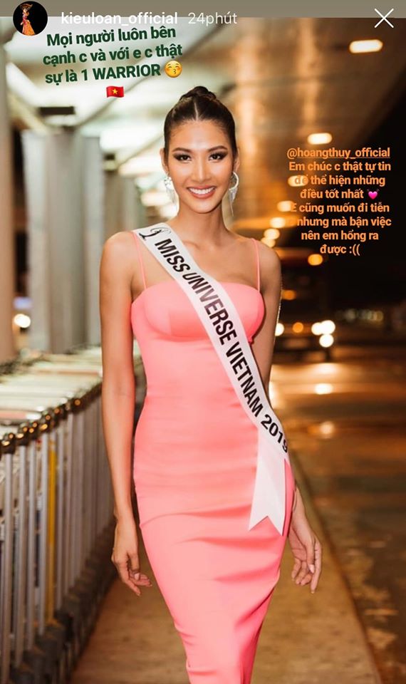 Sau khi nhận được lời cổ vũ và động viên từ Hoàng Thùy trong quá trình thi thố tại Miss Grand International 2019, mới đây, Kiều Loan hy vọng đàn chị sẽ thật tỏa sáng tại đường đua Miss Universe sắp tới: “Em chúc chị thật tự tin để thể hiện những điều tốt nhất. Mọi người luôn bên cạnh chị. Với em chị thật sự là một chiến binh”.