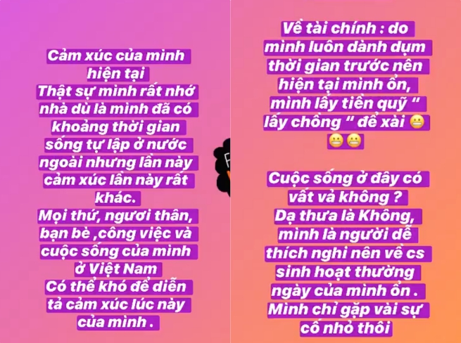 Trả lời những lo lắng của fan về tình hình “sức khỏe tài chính” của mình trong những ngày sống trên đảo, chân dài 1992 cho biết: “Về tài chính, do thời gian trước, Tú luôn dành dụm nên hiện tại mình ổn”. Người đẹp còn bật mí thêm đó là số tiền được trích từ quỹ “lấy chồng”. Để trấn an người hâm mộ, Minh Tú cho biết cuộc sống của người đẹp tại “xứ người” vẫn thoải mái. Tuy nhiên, cô nàng vẫn hy vọng sẽ sớm được về nước.