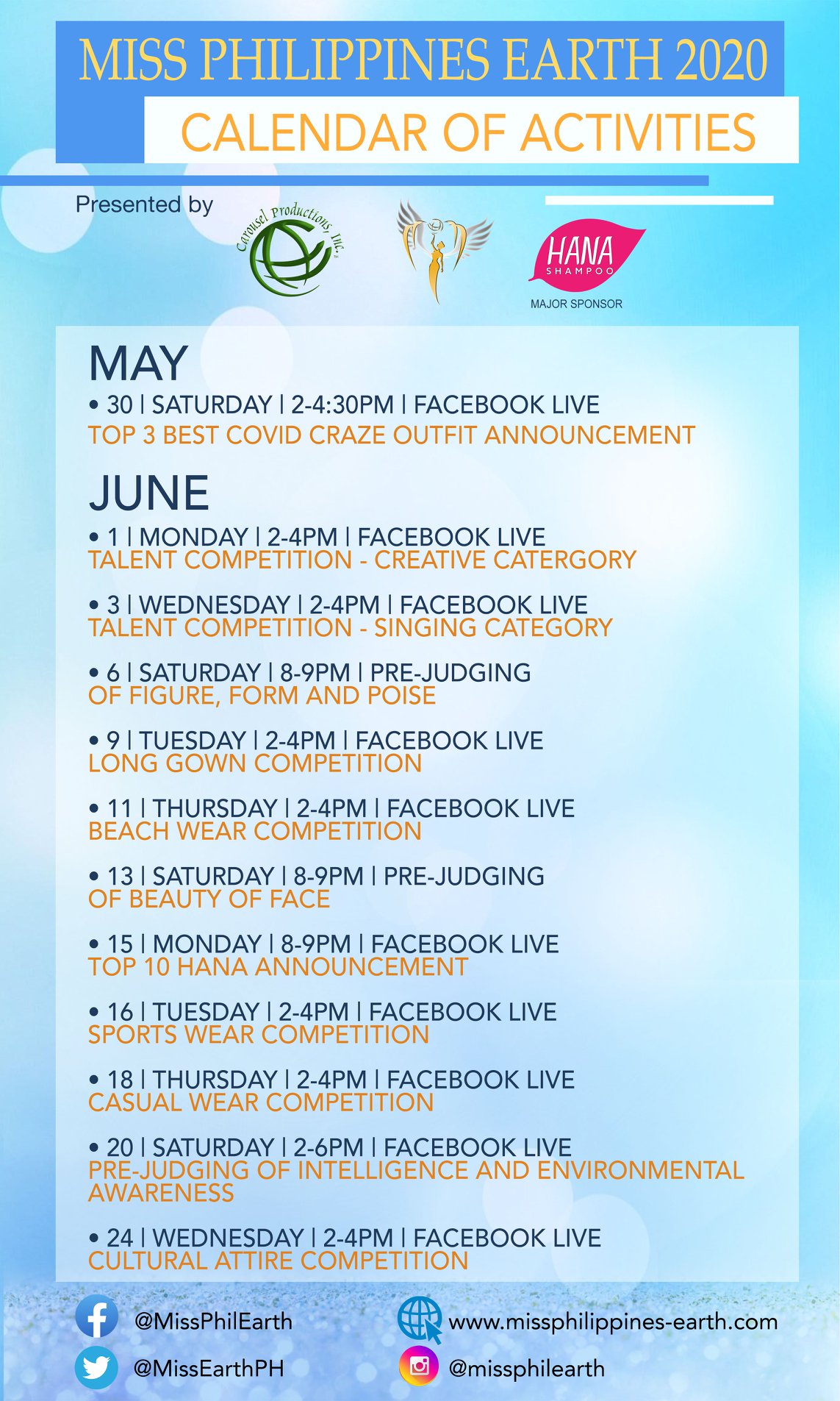 Lịch trình các họa động diễn ra của cuộc thi Hoa hậu Trái Đất Philippines với nhiều phần thi phụ hấp dẫn.