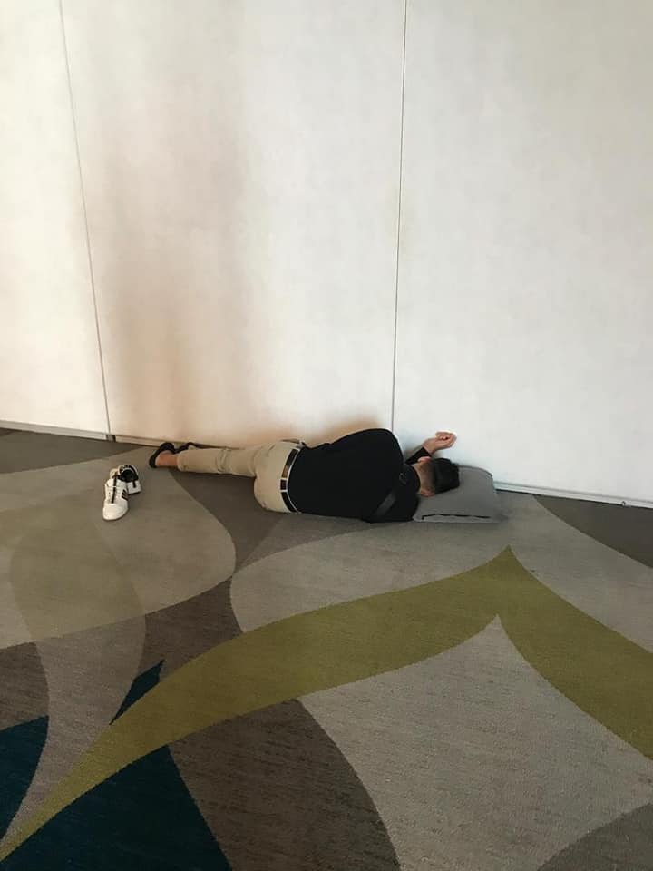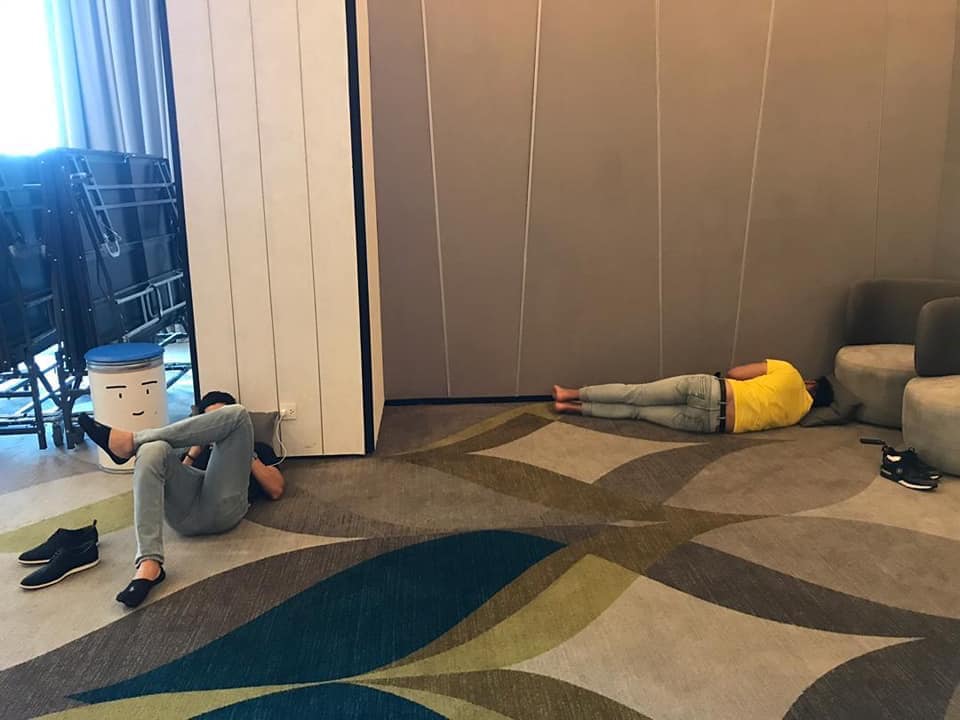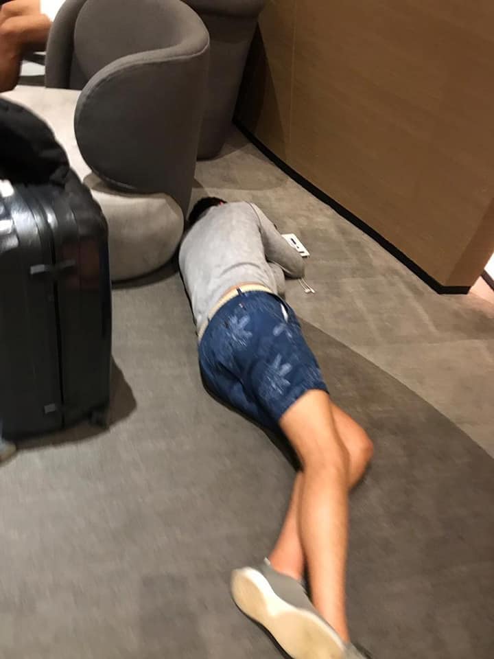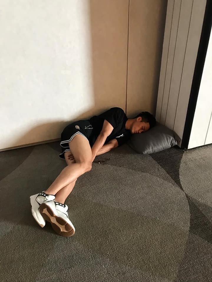 Thí sinh đại diện Việt Nam - Nguyễn Hùng Cường cũng phải vật vã ngủ trên sàn.