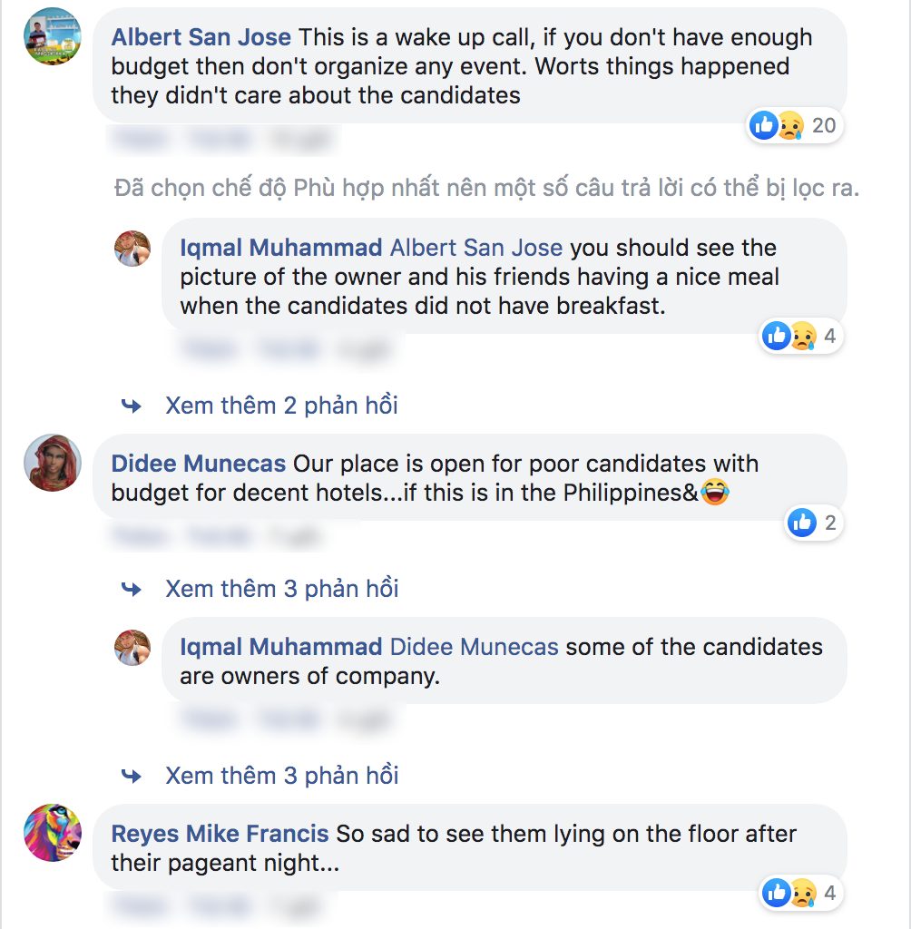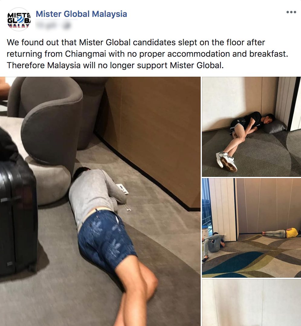 Vừa qua, Fanpage Mister Global Malaysia đăng tải dòng trạng thái bày tỏ sự bức xúc đối với tổ chức Mister Global - Nam vương Hoàn cầu về việc để các thí sinh tham gia cuộc thi ngủ ngay trên sàn nhà sau khi trở về từ chuyến đi dài đến Chiangmai. Dường như đại diện các quốc gia tham dự cuộc thi năm nay không được hưởng bất kỳ dịch vụ khách sạn quy chuẩn nào.