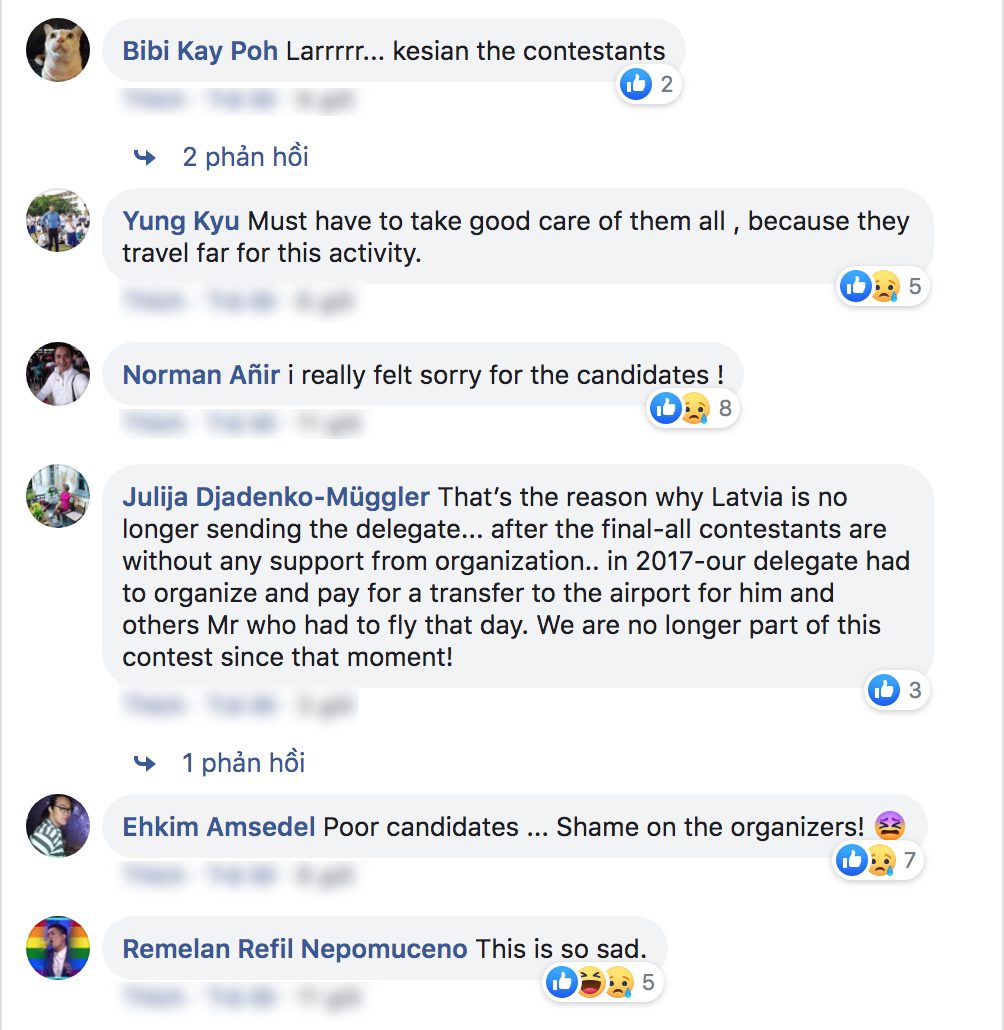 Không chỉ thể hiện sự bức xúc, phẫn nộ với cách làm việc thiếu chuyên nghiệp của tổ chức Mister Global, người hâm mộ còn kêu gọi “tẩy chay” cuộc thi. Bên cạnh những bình luận gay gắt, cũng có không ít những chia sẻ cho rằng cuộc thi vì thiếu kinh phí tổ chức nên đã dẫn đến sự việc này.