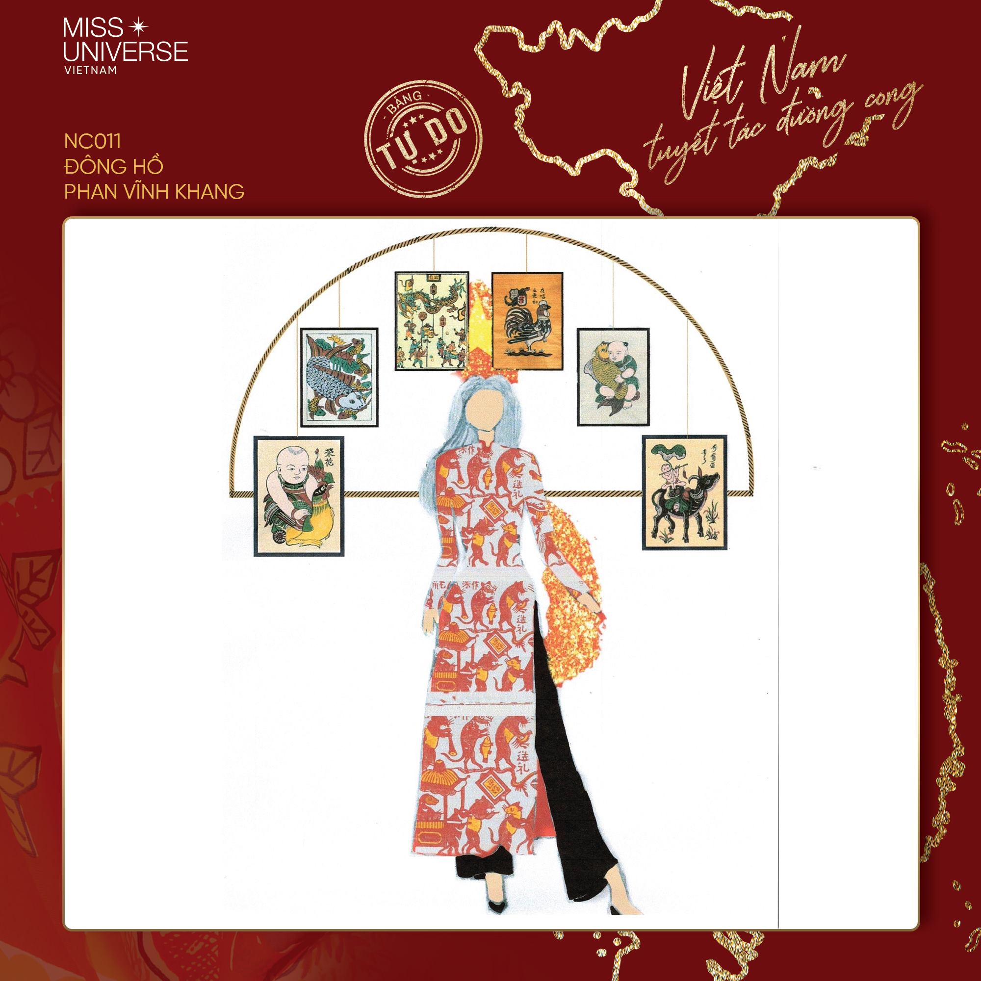 Ý tưởng bộ trang phục đến từ những bức tranh Đông Hồ dân gian, màu sắc truyền thống mang lại cảm giác vừa quen vừa lạ khi kết hợp cùng chiếc áo dài Việt Nam tạo nên một sự cách điệu bắt mắt.