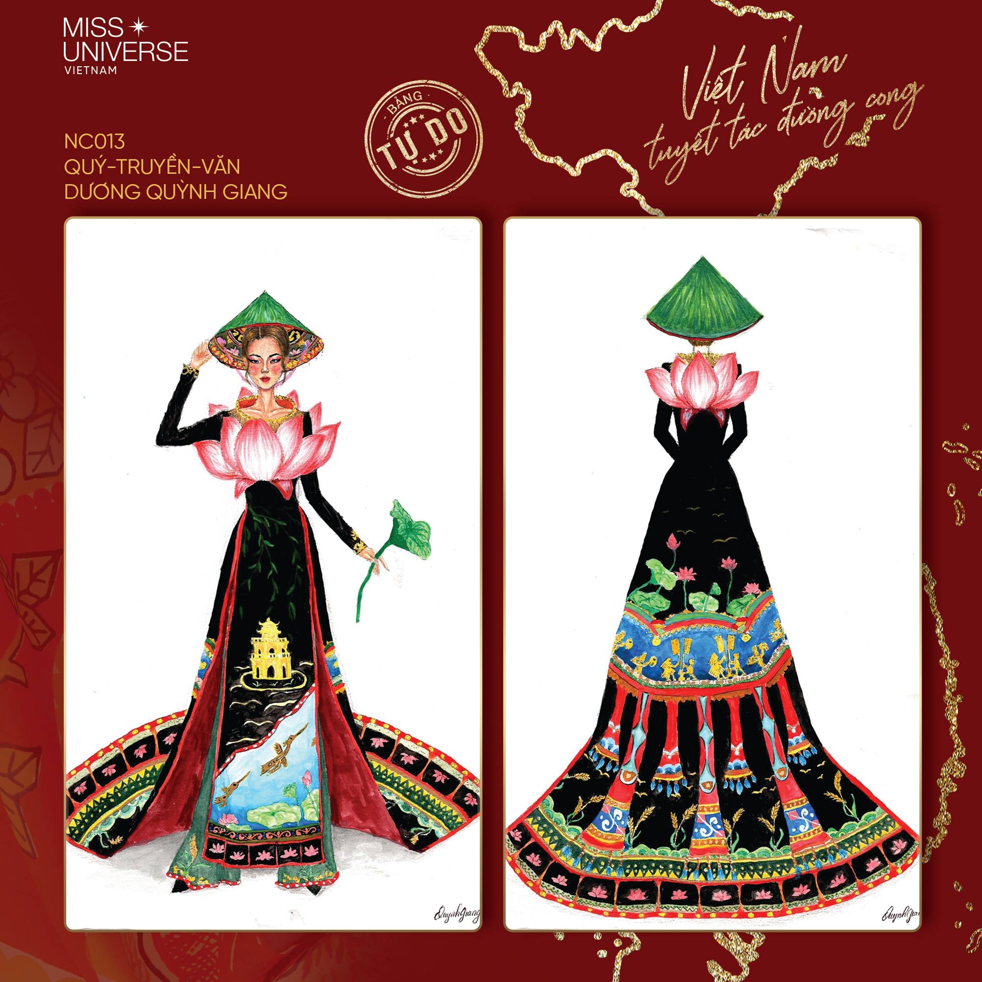 Lấy ý tưởng từ những hình ảnh thân thuộc nhất của Việt Nam đó là hoa sen, Hồ Gươm, đồng lúa… kết hợp với họa tiết của các dân tộc thiểu số, trống đồng… Tôi đã thiết kế hoàn chỉnh trang phục áo dài “Quý – Truyền – Văn”.