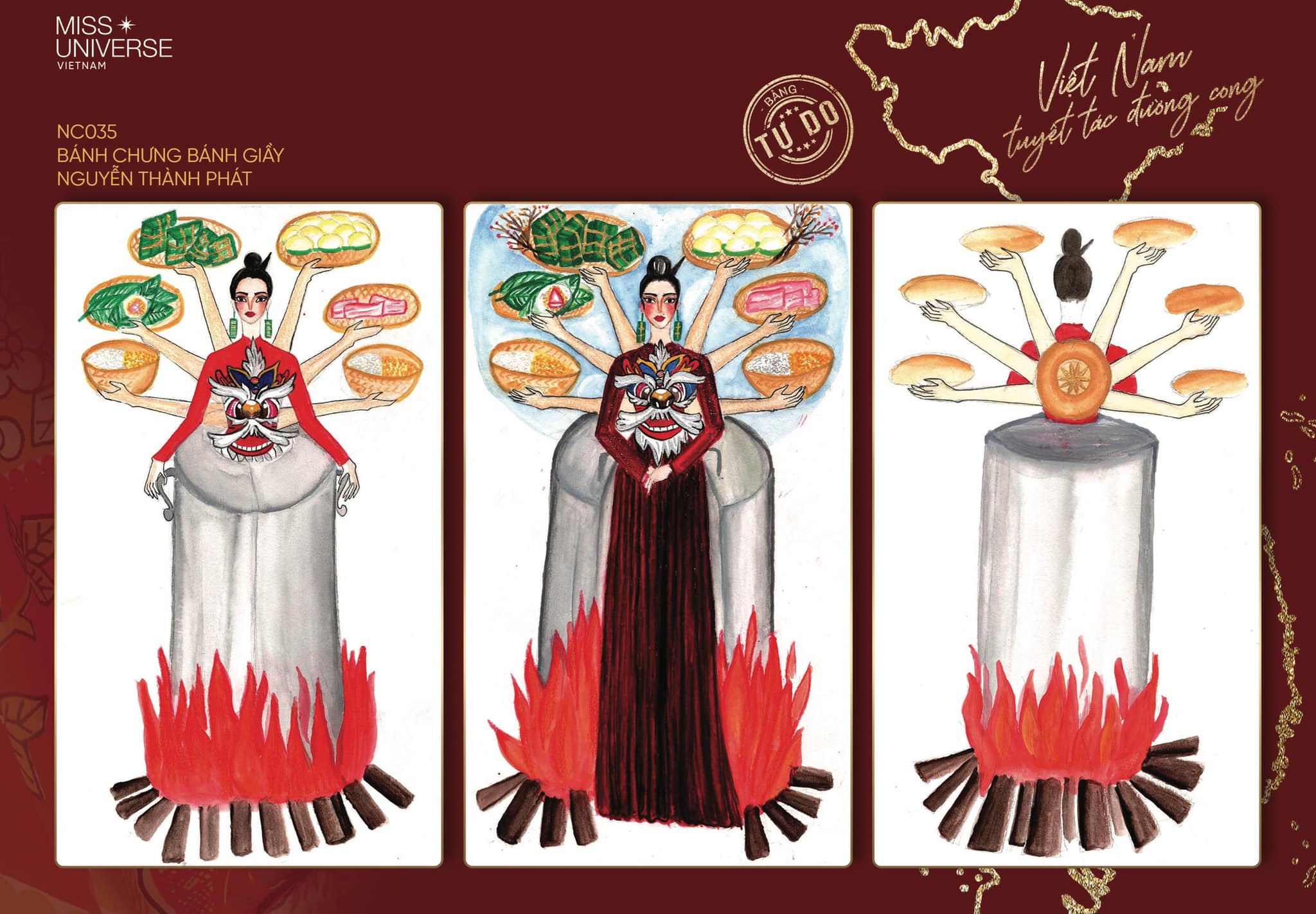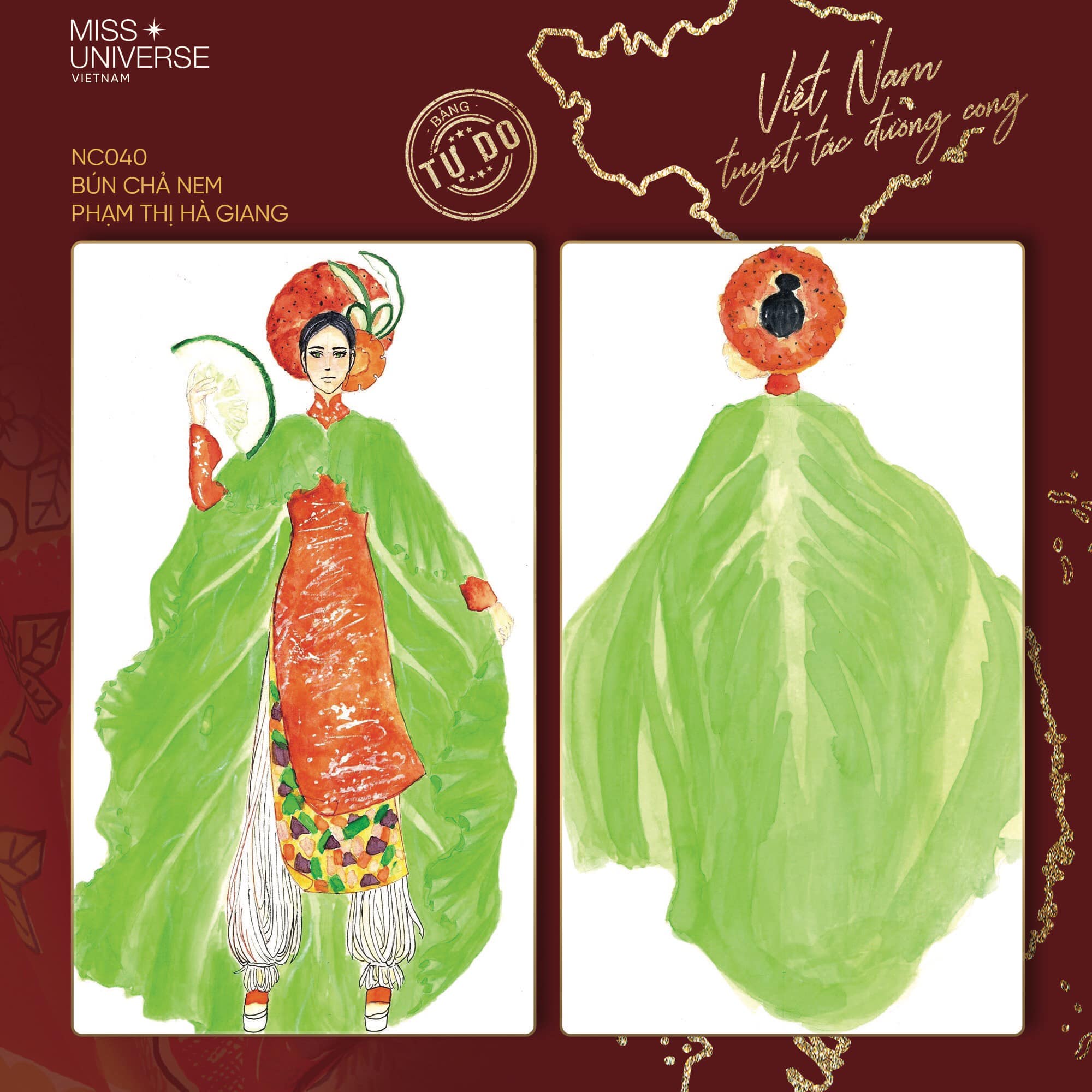 Thiết kế lấy cảm hứng từ món Bún chả nem được tác giả diễn giải khăn vấn đội đầu là chả thịt, phần thân áo thì lớp tà áo mỏng bên ngoài sẽ là mặt rán của nem, bên trong là nhân. Cuối cùng là quần sẽ là bún và áo choàng sẽ là rau xà lách.