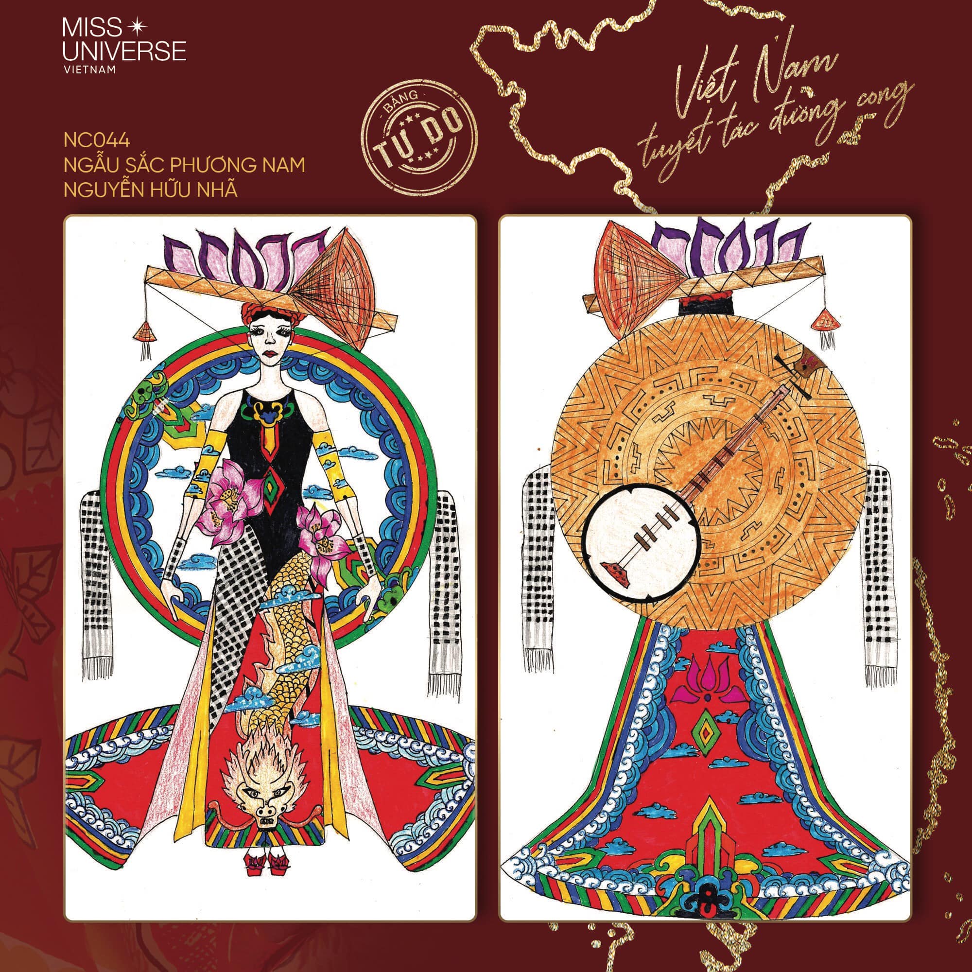 Ý tưởng đưa loại hình văn hóa nghệ thuật dân gian Đờn ca tài tử lên Trang phục dân tộc tuy không mới nhưng cách kết hợp pha trộn như mẫu National Costume “Ngẫu sắc Phương Nam” lại vô cùng ấn tượng bởi thiết kế được lấy cảm hứng từ sự mộc mạc đến chân chất của chiếc khăn rằn Nam Bộ kết hợp với cái vẻ uy nghi, tinh tế của hoa văn trên áo Nhật Bình của các phi tần trong cung triều Nguyễn. Sự ngẫu hứng biến tấu màu sắc vừa mộc mạc đến sang trọng. Từ âm vang nơi đất Mũi với chiếc đàn Kìm và tiếng trống đồng Đông Sơn, tất cả mang đến sự phá cách.
