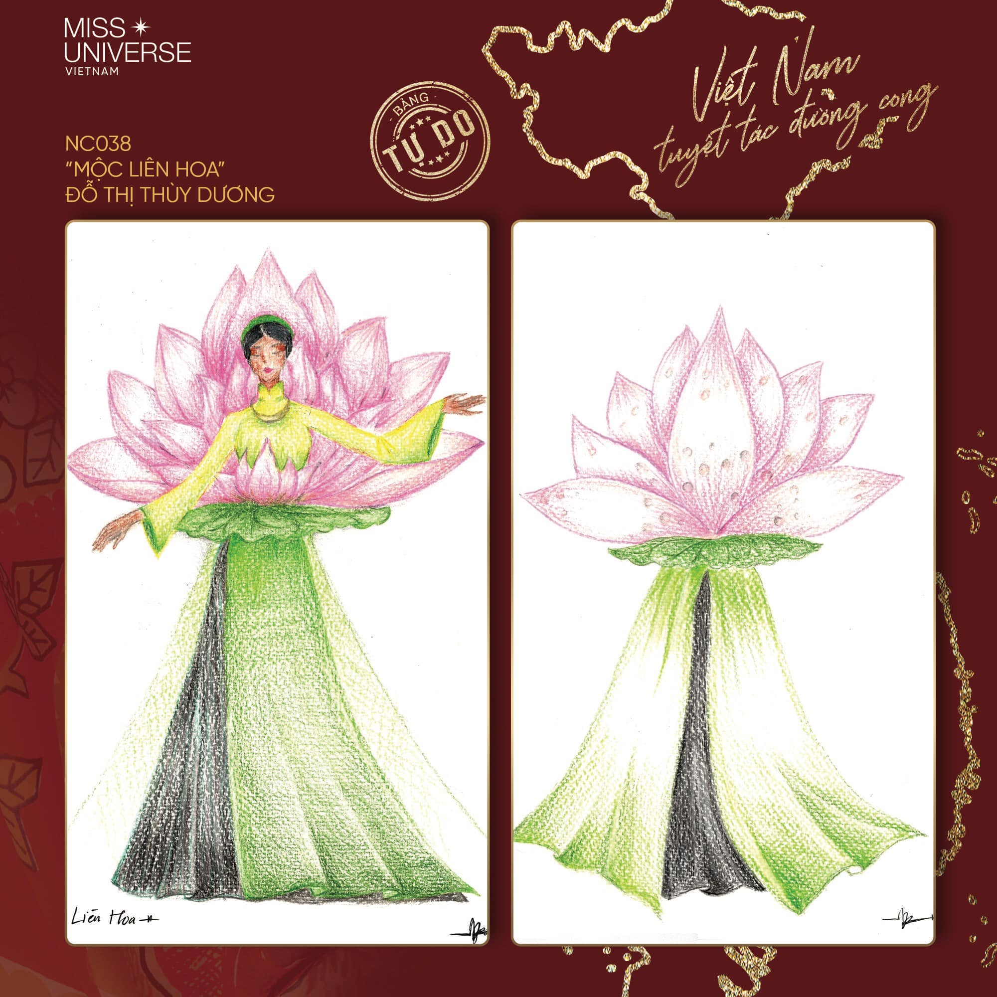 Mộc Liên Hoa – Bộ trang phục được lấy ý tưởng về hình tượng hoa sen. Hoa sen không chỉ là Quốc hoa của Việt Nam, đại diện cho người Việt Nam nói chung mà còn đại diện cho người phụ nữ Việt nói riêng.