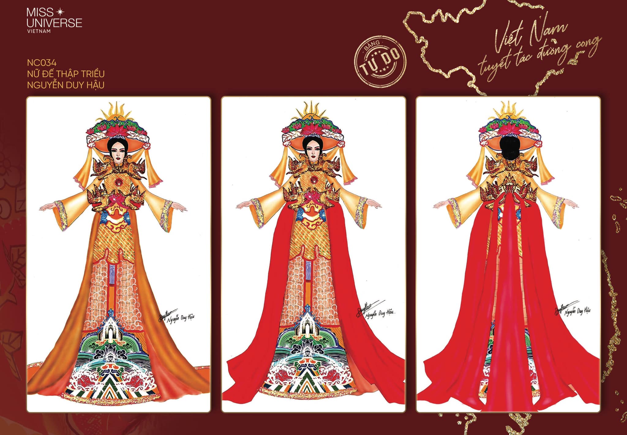 Thiết kế Nữ đế thập triều được bắt nguồn từ sự uy nghi của hoàng hậu xa xưa. Trang phục được kết hợp giữa hiện đại và truyền thống. Đó là sự kết hợp giữa “áo dài” và “áo giáp” thời Lý. Hình ảnh rồng phun lụa thể hiện niềm tin của con dân Việt Nam qua các thời kỳ kháng chiến. Qua đó còn thể hiện sự đoàn kết của nhân dân ta.