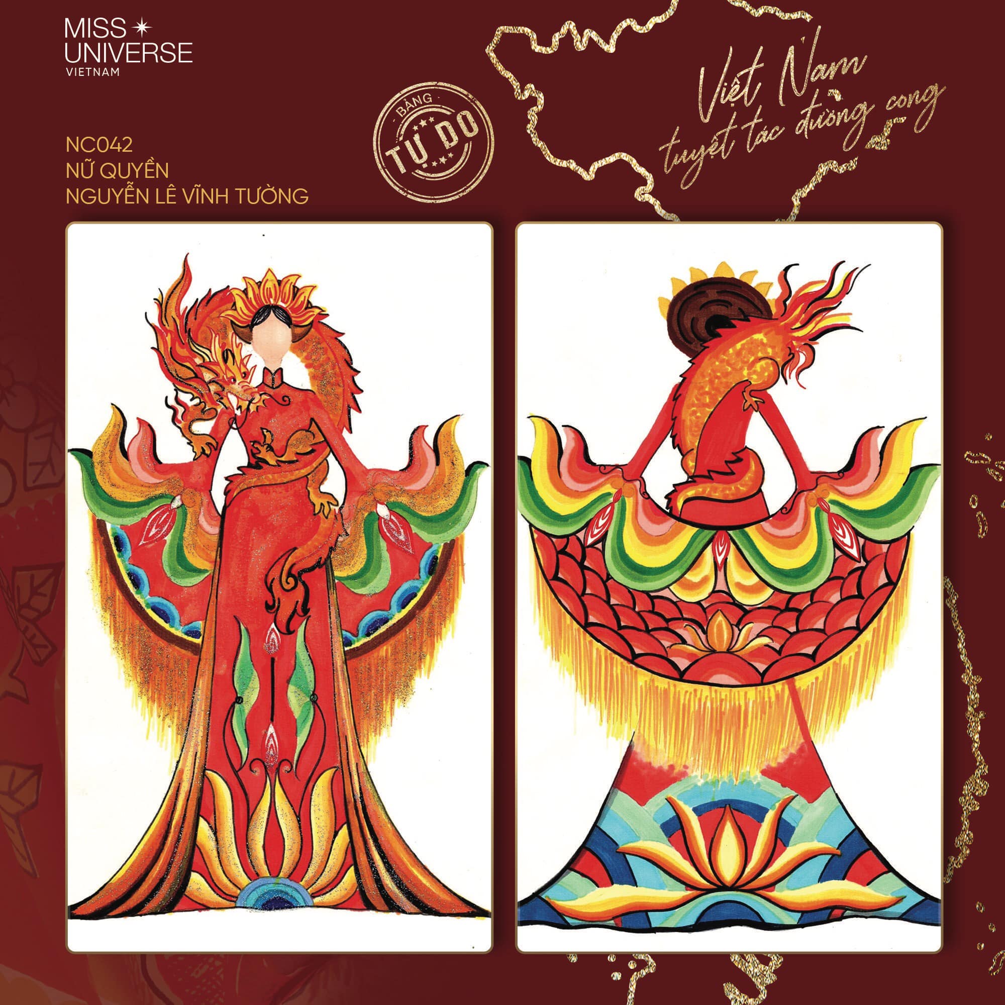 Thiết kế Nữ quyền lấy ý tưởng từ hình ảnh con rồng kết hợp với áo dài đỏ cùng hoa sen. Rồng đang uốn lượn như che chở cho người phụ nữ, thể hiện sự quyền lực.