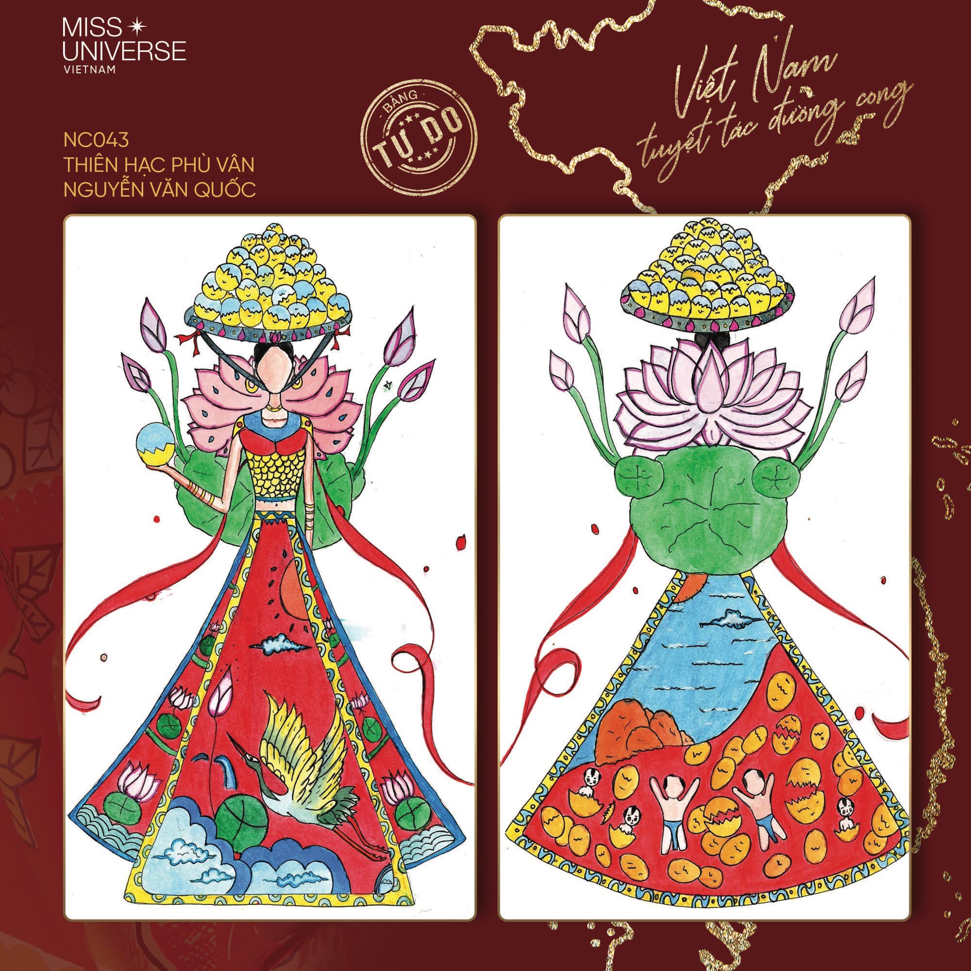 Từ xa xưa, hình ảnh người mẹ Âu Cơ với trăm trứng đã đi vào tiềm thức của con người Việt Nam, lấy cảm hứng từ hình ảnh đó kết hợp với những đóa sen hồng là Quốc hoa của đất nước ta, từ sự kết hợp của hai nét đặc trưng hàng đầu đã cho ra thiết kế trang phục “Thiên Hạc Phù Vân” mang đậm bản sắc dân tộc.