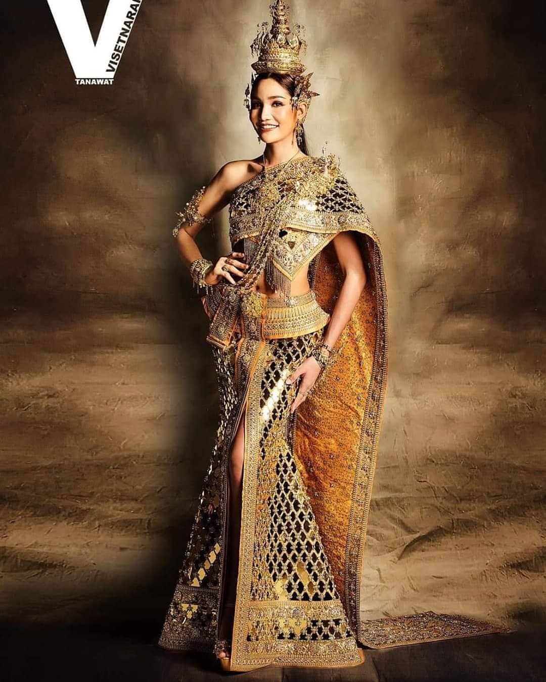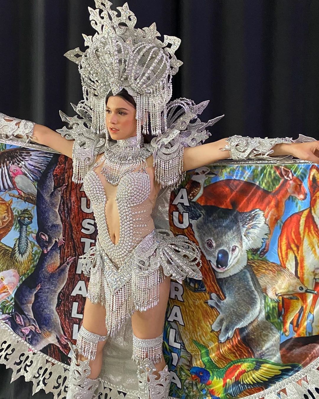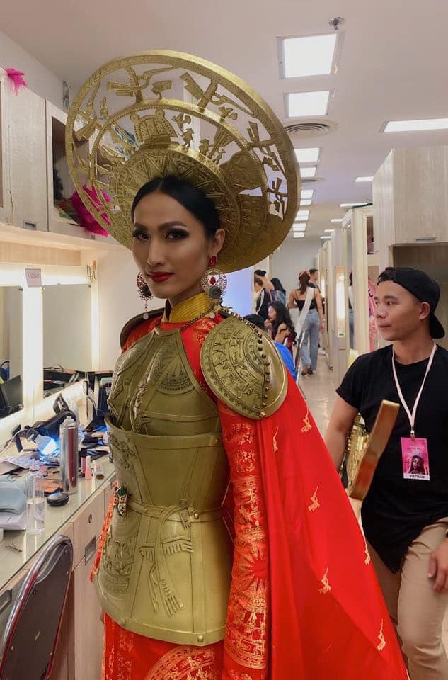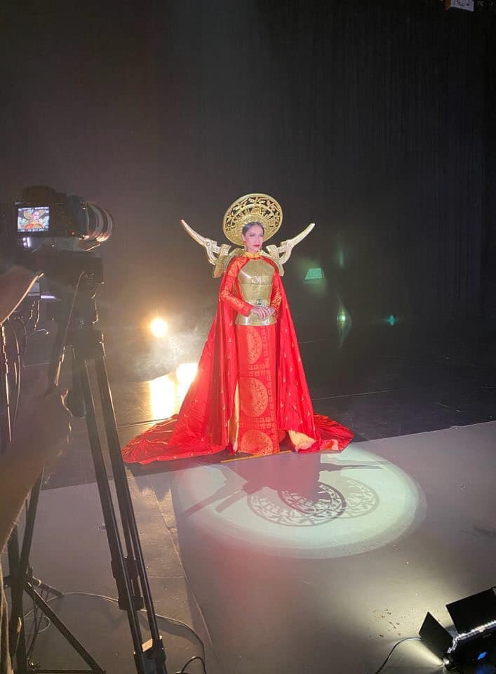 Hôm qua, sau vòng phỏng vấn, Hoài Sa và 21 thí sinh cũng bước vào buổi chụp hình cho phần thi trang phục dân tộc. Những bộ cánh ấn tượng, sặc sỡ màu sắc được đại diện các quốc gia đầu tư công phu và hoành tráng để thể hiện được văn hóa của đất nước mình trong cuộc thi. Tại Miss International Queen 2020, Hoài Sa lựa chọn áo dài là National Costume, mẫu thiết kế thể hiện được sự quyền lực với 2 gam màu đỏ và vàng làm chủ đạo.