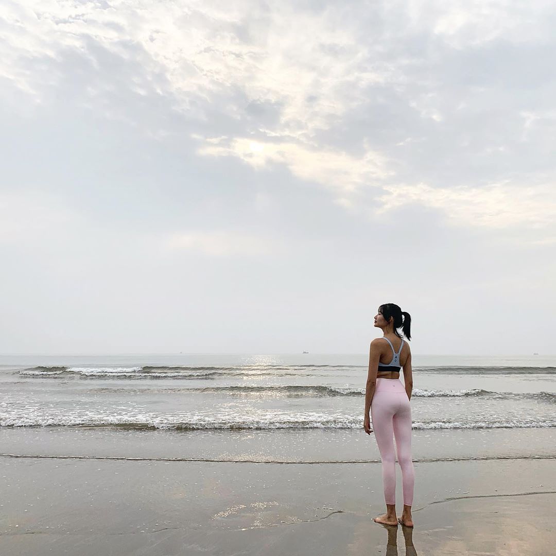 Á hậu Hoàng Thùy về quê thăm ông bà. Người đẹp diện đồ thể thao khoe dáng thon trên bờ biển.