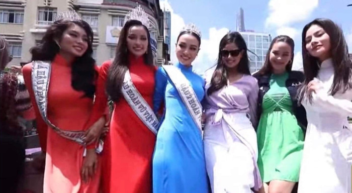 Ngày đầu đảm nhiệm vị trí tân Hoa hậu Hoàn vũ Việt Nam, Ngọc Châu "đốt cháy" trời hè khi diện tà áo dài đỏ rực rỡ trong chuyến city tour ngày 26/6.