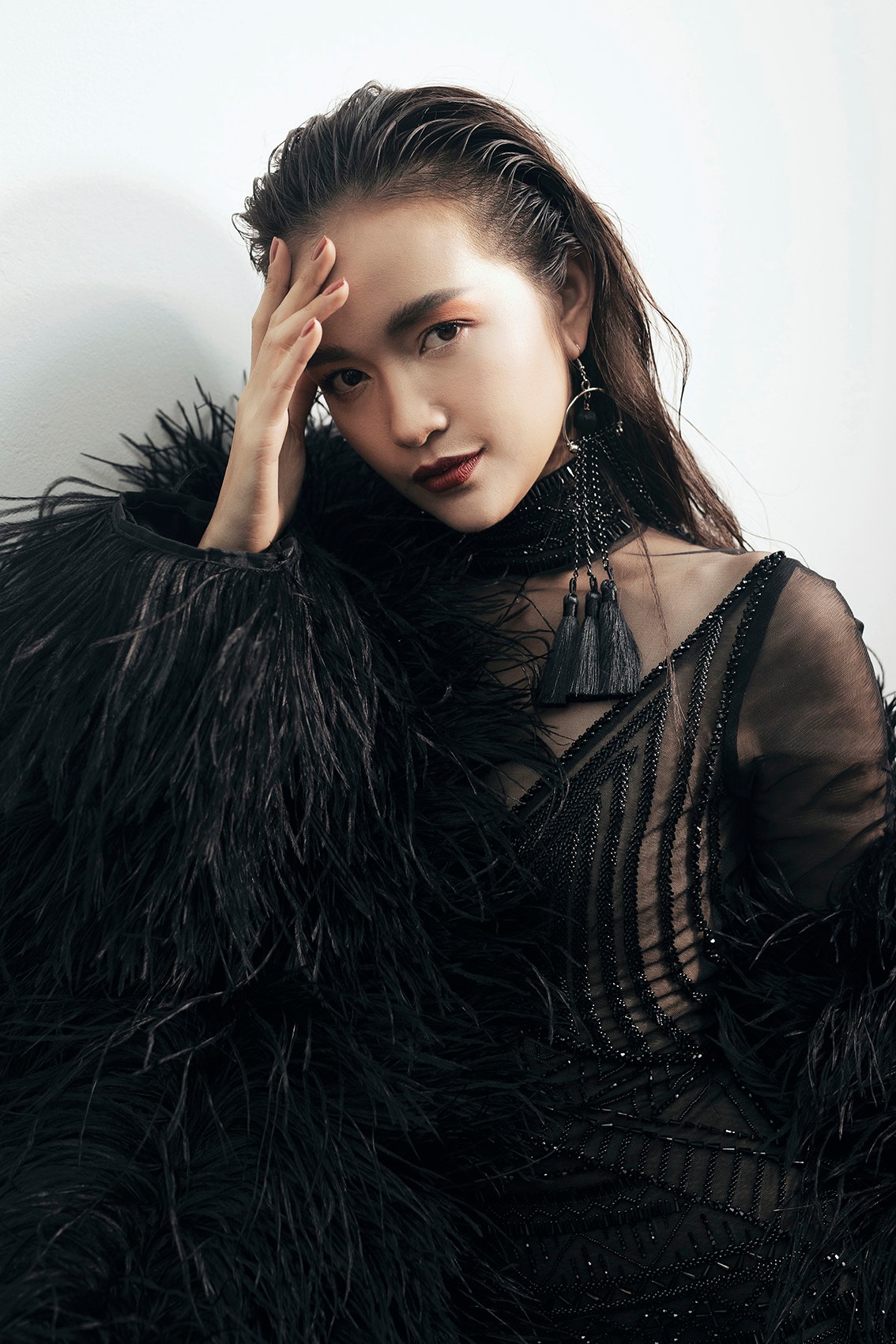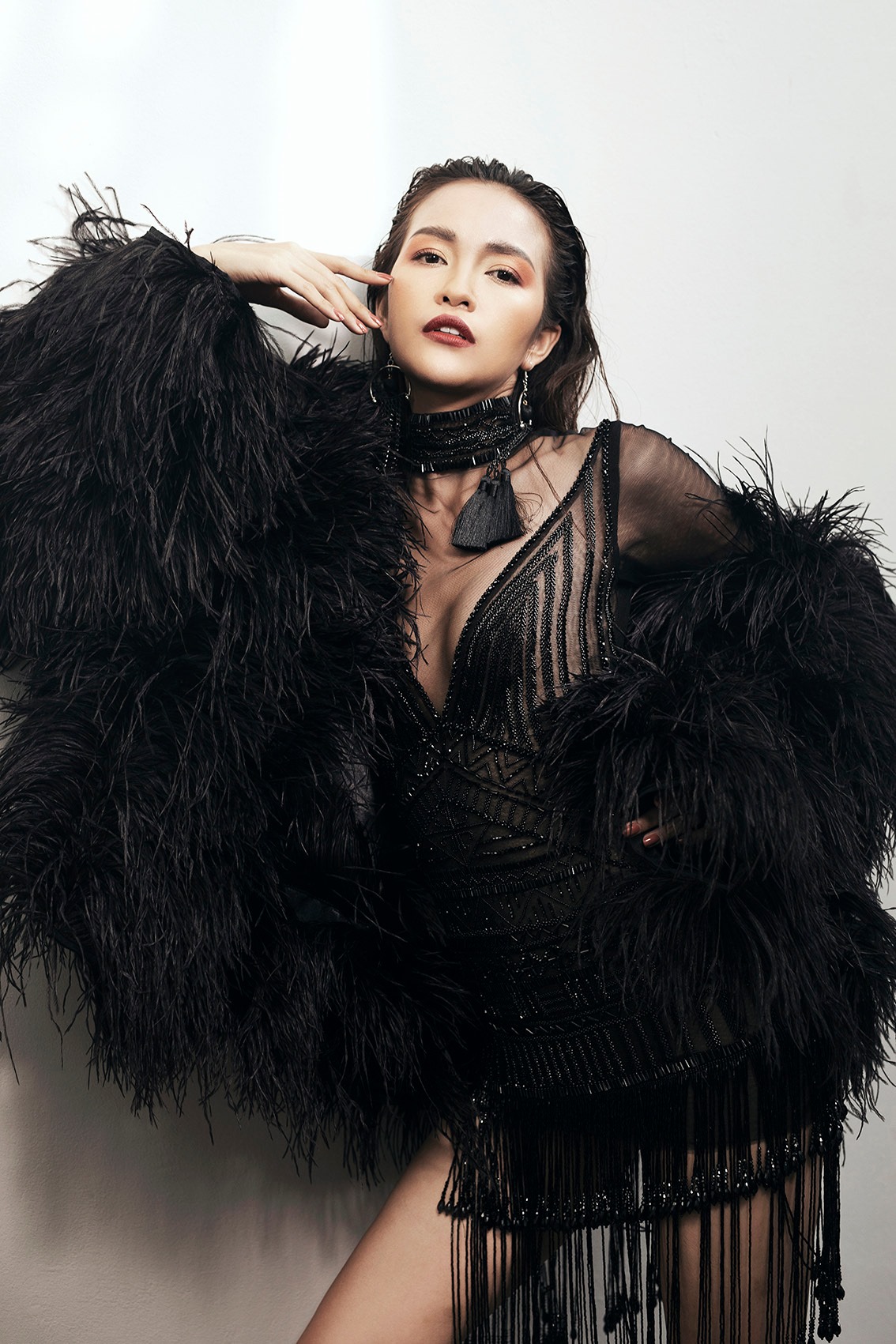 Diện trên mình bộ trang phục màu đen huyền bí, nhưng Ngọc Châu vẫn nổi bật bật nhờ thần thái rạng ngời của mình.