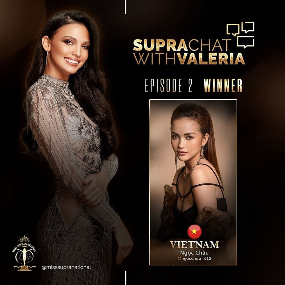 Sau giải nhì phần thi Miss Elegance, đại diện Việt Nam tiếp tục mang về tin vui khi chiến thắng phần thi SupraChat cùng với đương kim hoa hậu Valeria. Ngọc Châu tham gia phần thi này cùng với 7 thí sinh khác trong cuộc thi nhưng vì phong cách trả lời vui vẻ, đầy tự tin và thông điệp được cô nàng trình bày một cách rõ ràng, khéo léo, chính vì vậy, Ngọc Châu đã xuất sắc chiếm trọn spotlight trong buổi phỏng vấn này với khán giả.