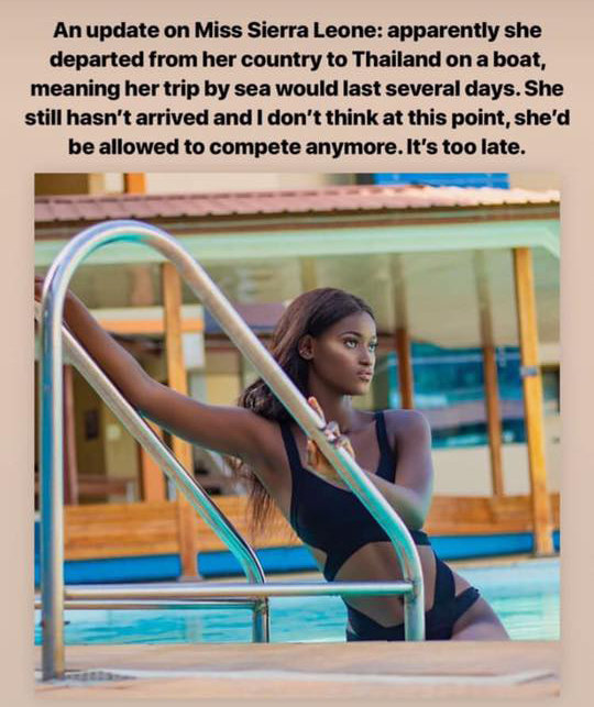 Năm 2018, Miss Universe chứng kiến trường hợp “hi hữu” xảy ra với đại diện Sierra Leone - Marie Esther Bangura. Cô nàng bị mất tích nhiều ngày liền trong quá trình di chuyển đến Thái Lan bằng đường biển. Được biết lý do người đẹp đi tàu đến địa điểm tổ chức là vì để tiết kiệm chi phí. Tuy nhiên, khi đặt chân đến “xứ sở chùa vàng”, cuộc thi đã trải qua gần 1/3 chặng đường, thế nên, người đẹp đành lỡ hẹn với sân khấu Hoa hậu Hoàn vũ năm đó.