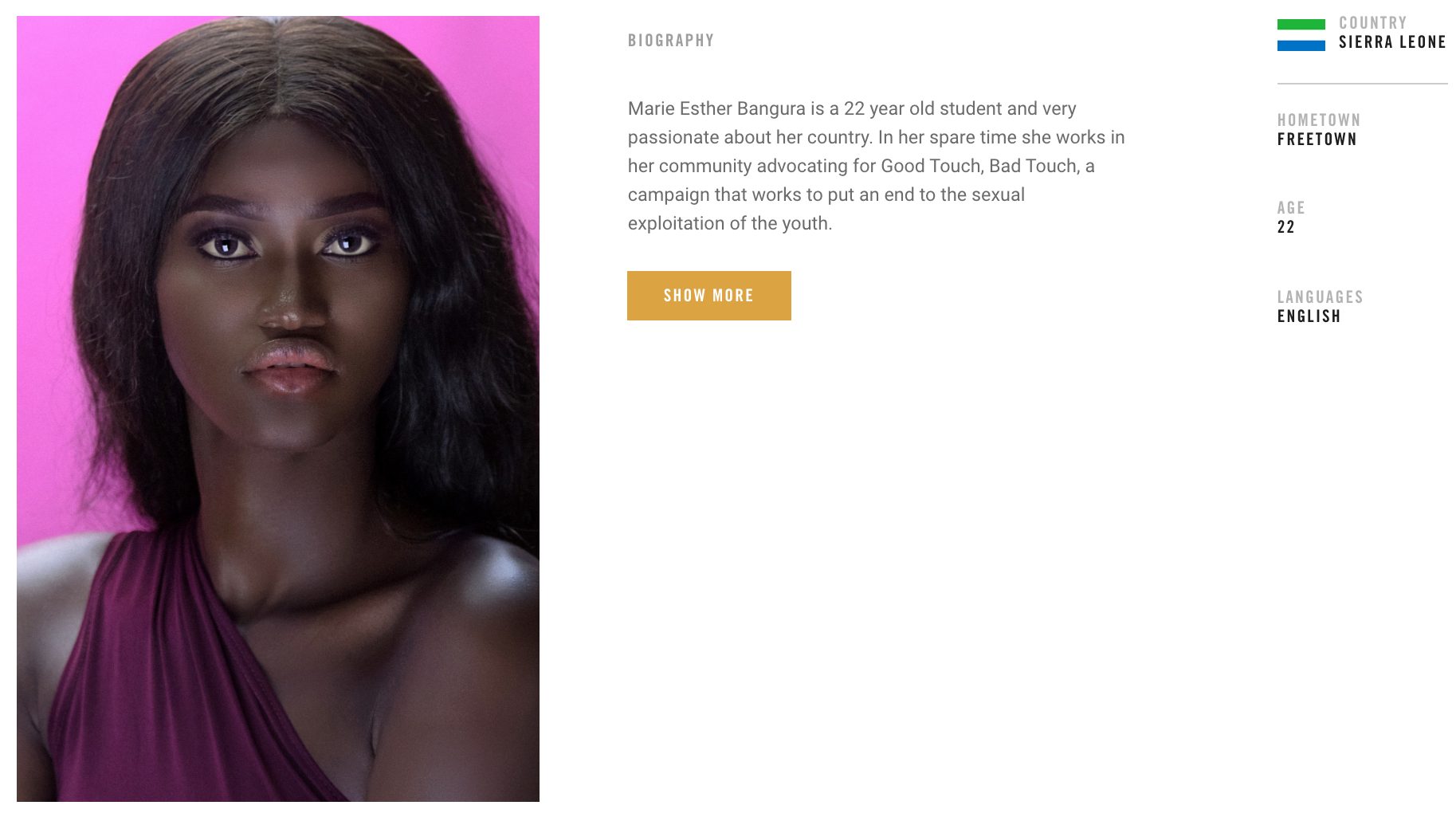 Đại diện Sierra Leone - Marie Esther Bangura từng phải bỏ thi Miss Universe 2018 và quay lại với cuộc thi vào năm nay.