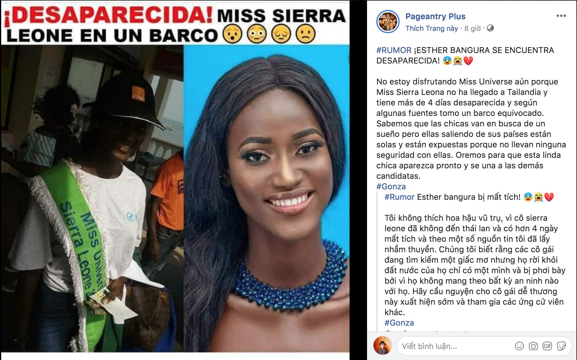 Loạt fan quốc tế chia sẻ về thông tin Miss Universe Sierra Leone 2018 - Marie Esther Bangura mất tích nhiều ngày liền trong quá trình di chuyển đến Thái Lan bằng đường biển.