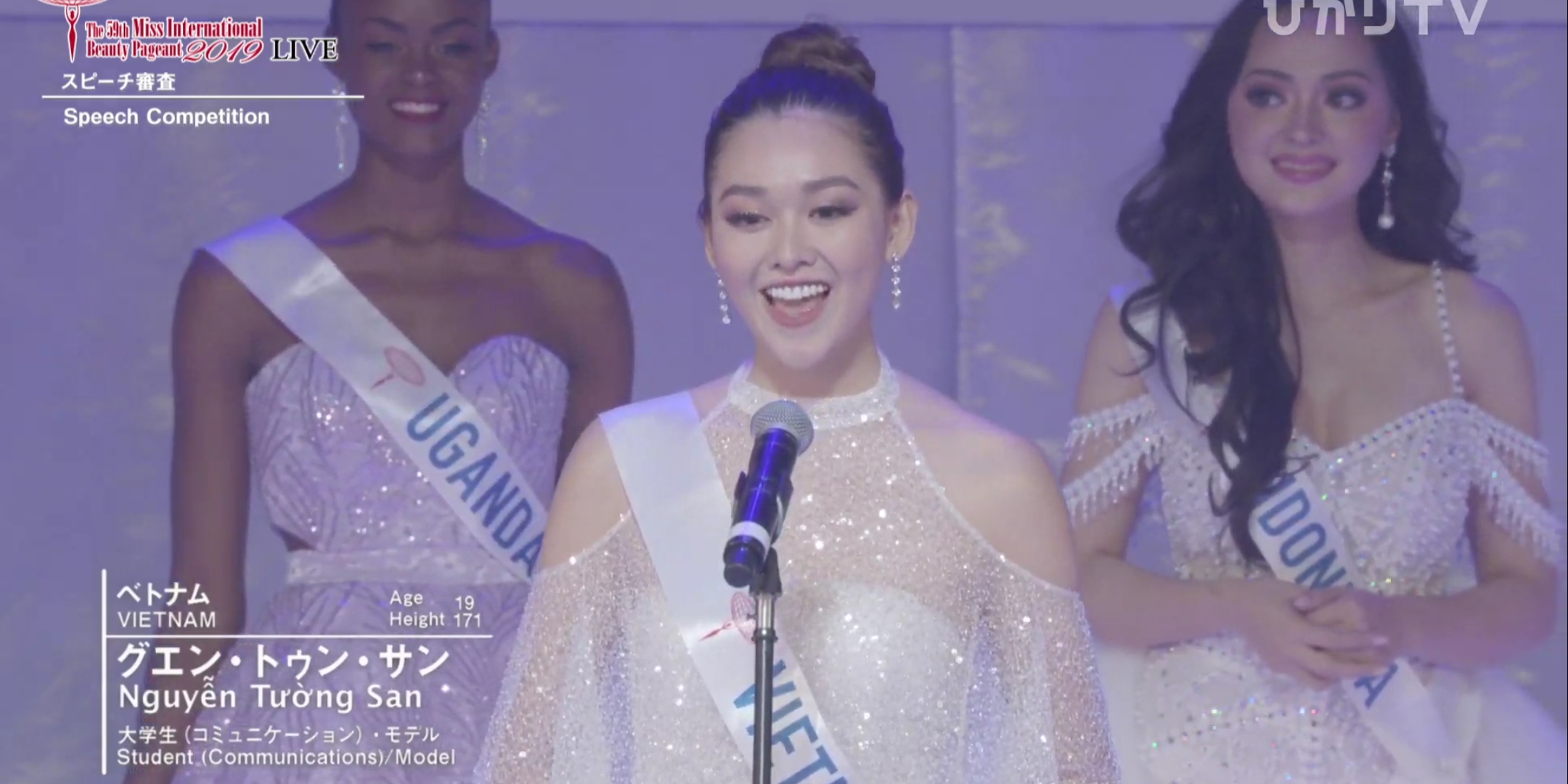 Đại diện Việt Nam - á hậu Tường San đã có phần diễn thuyết trôi chảy và vô cùng ấn tượng. Khép lại hành trình Miss International 2019, về đích ở vị trí Top 8 được xem là thành tích đáng ngưỡng mộ của người đẹp sinh năm 2000.
