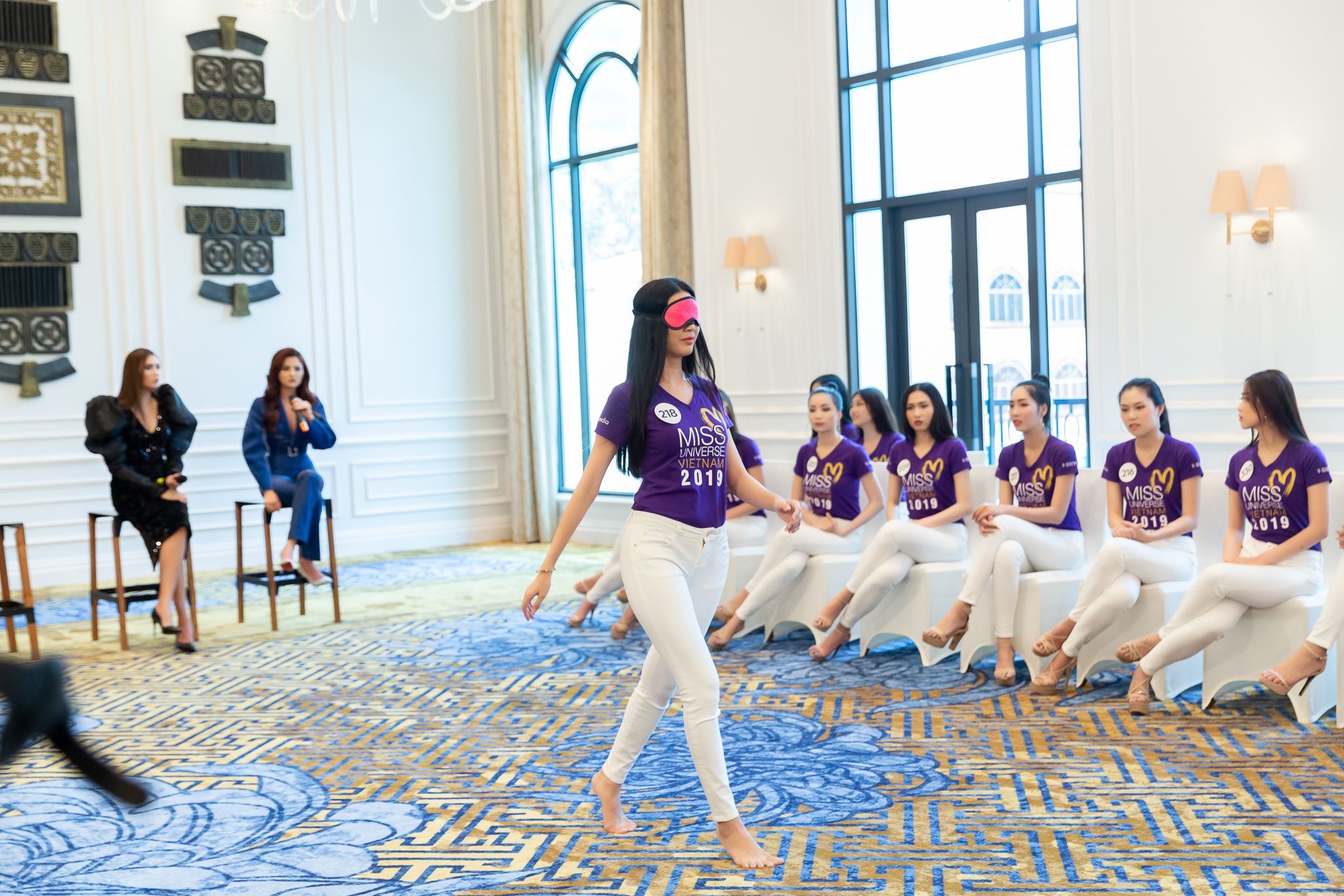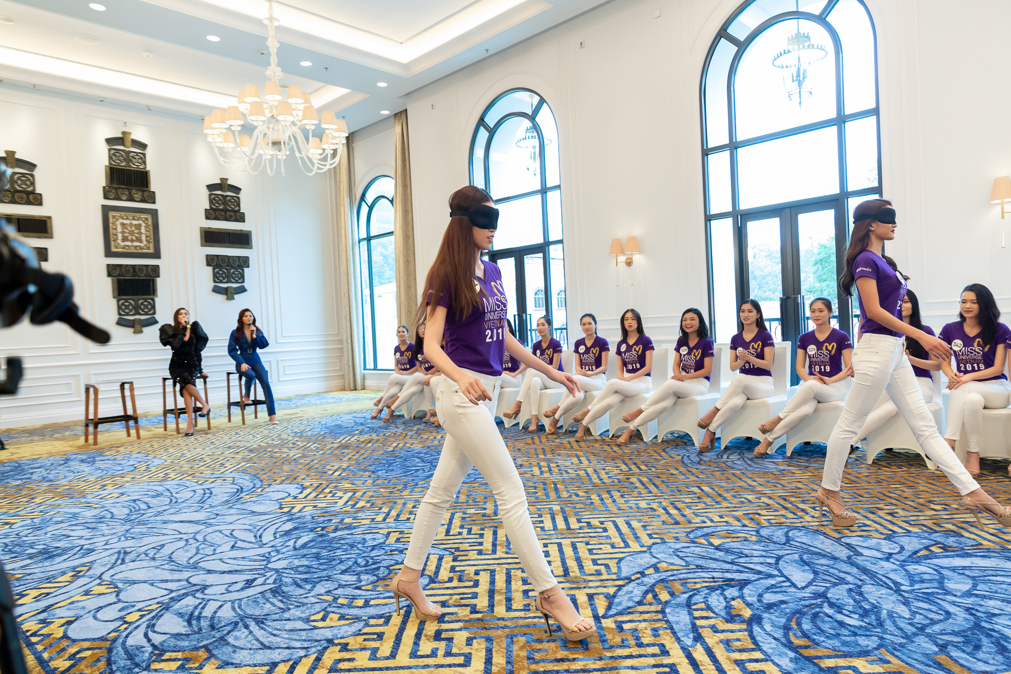 Vũ Thu Phương và Võ Hoàng Yến trổ tài catwalk đúng chuẩn hoa hậu với bịt mắt.