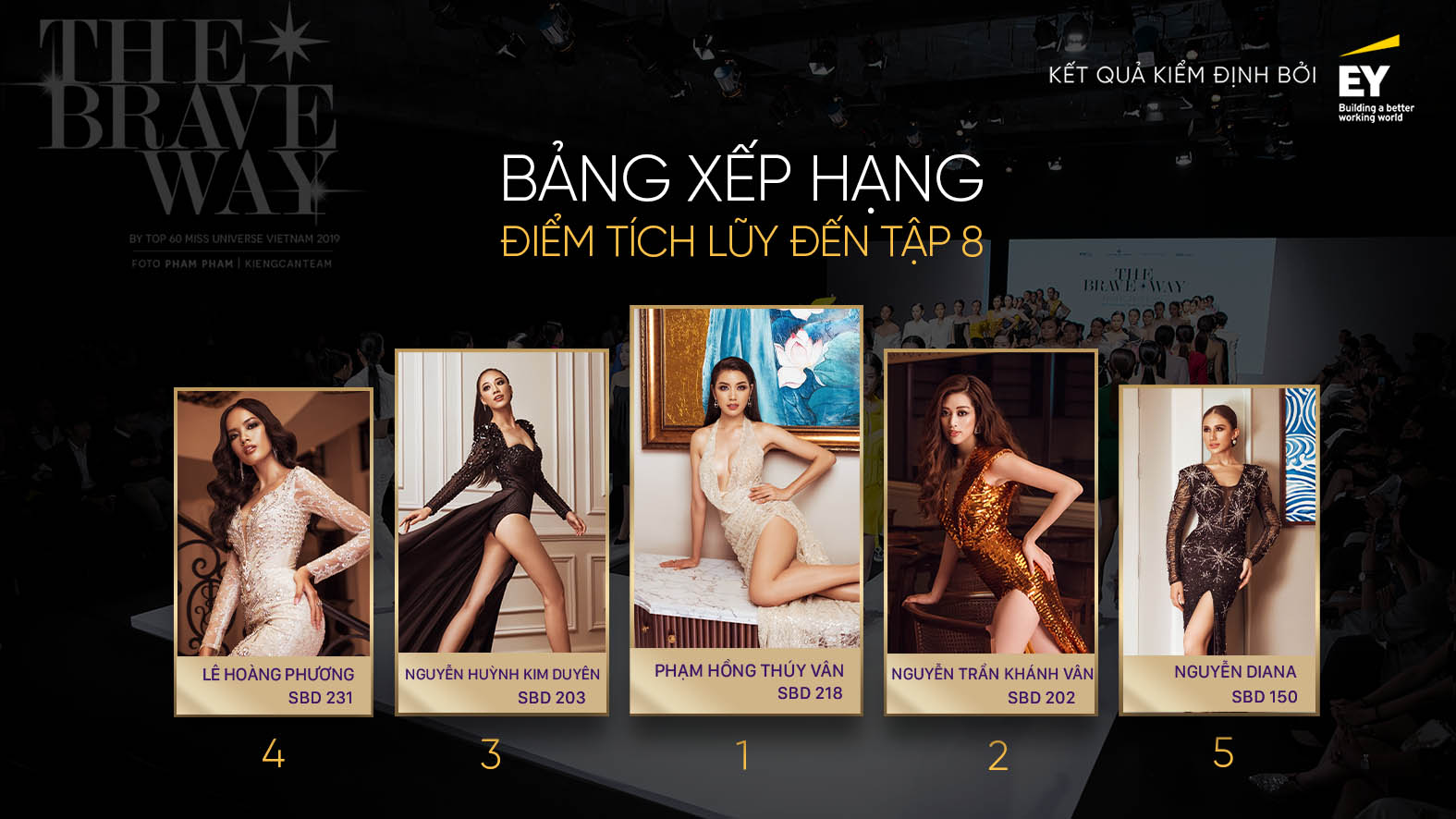 Miss Universe Vietnam 2019 đang bước vào chặng đua nước rút để tìm ra chủ nhân xứng đáng nhất của chiếc vương miện Brave Heart. Chiến thắng 3 tập liên tiếp, hiện tại Thúy Vân đang là thí sinh có tổng điểm dẫn đầu bảng xếp hạng. Theo sát nút với Thúy Vân, Kim Duyên, Khánh Vân, Hoàng Phương và Nguyễn Diana đều luôn cố gắng hết mình để vươn lên vị trí dẫn đầu.
