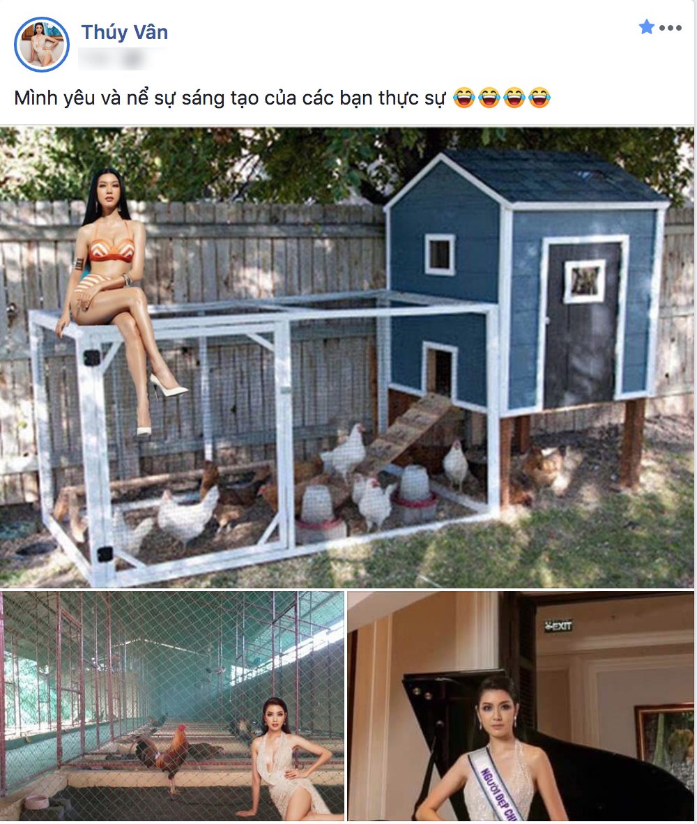Khi thấy hình ảnh shooting trang phục dạ hội và bikini của mình được fan chu đáo tách nền ghép cảnh chuồng gà ở phía sau, Thúy Vân bất ngờ chia sẻ lên trang cá nhân và kèm theo lời nhắn: “Mình yêu và nể sự sáng tạo của các bạn thực sự”. Theo các fan của người đẹp, “Miss chuồng gà” là cách ví von hóm hỉnh Thúy Vân có tố chất và kinh nghiệm để khiến bản thân nổi bật trong nhiều thử thách của cuộc thi: