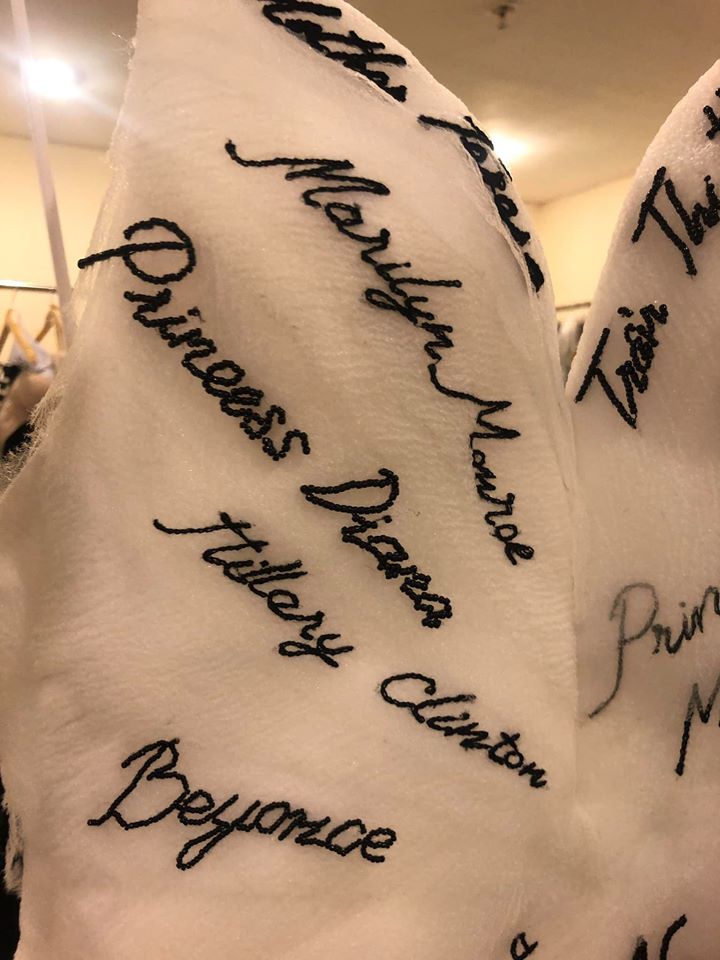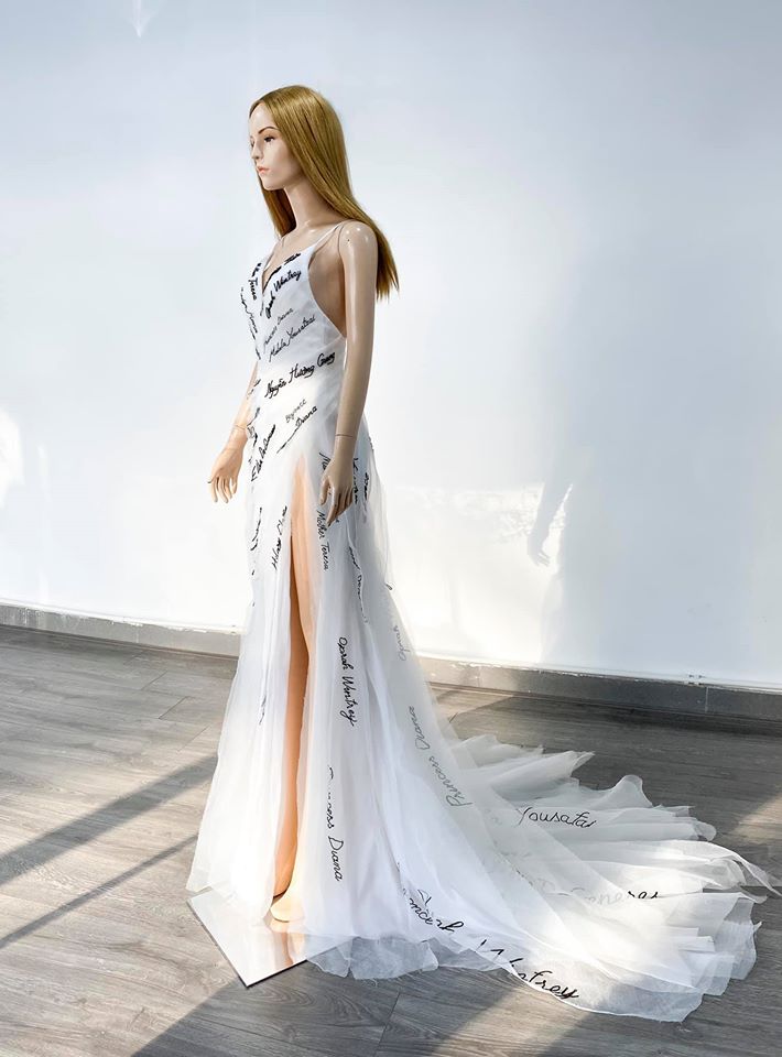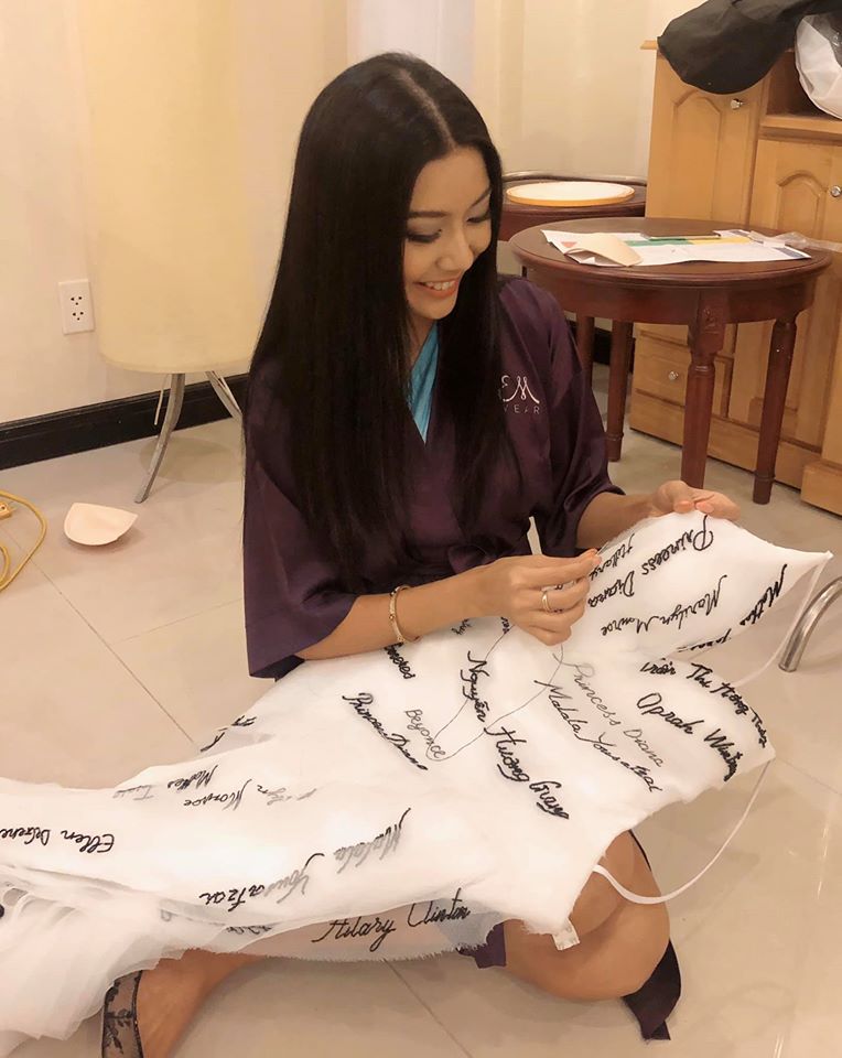 NTK bộ đầm dạ hội của Thúy Vân chia sẻ: “Những cái tên trên bộ váy được góp nhặt từ tên của những phụ nữ từng được giới thiệu trên Inspired by SHE của Vân, cũng là những người đã truyền cảm hứng trong cuộc sống của Thúy Vân như mẹ Teresa, Ellen Degeneres, Marilyn Monroe, Beyonce, công chúa Diana, Oprah Winfrey, Hillary Clinton, Hoa hậu Hương Giang, Trần Thị Hồng Thúy (mẹ Thuý Vân)… để thêu trên bộ váy này. Trong đó, tên mẹ của Vân đặt ở ngực trái theo đề nghị của em ấy, vì đó nơi thiêng liêng nhất, nơi gần trái tim Vân nhất”.