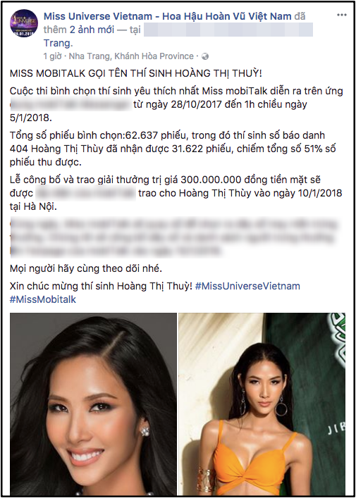 Vẫn chưa dừng lại, cách đây ít phút giải thí sinh được bình chọn nhiều nhất thông qua ứng dụng mobile tiếp tục gọi tên người đẹp gốc Thanh Hóa. Theo đó, vượt qua 41 thí sinh khác, chiếm 51% số phiếu bình chọn trong tổng 62.637 phiếu, Hoàng Thuỳ chính thức mang về giải thưởng tiền mặt hấp dẫn lên đến 300 triệu đồng.
