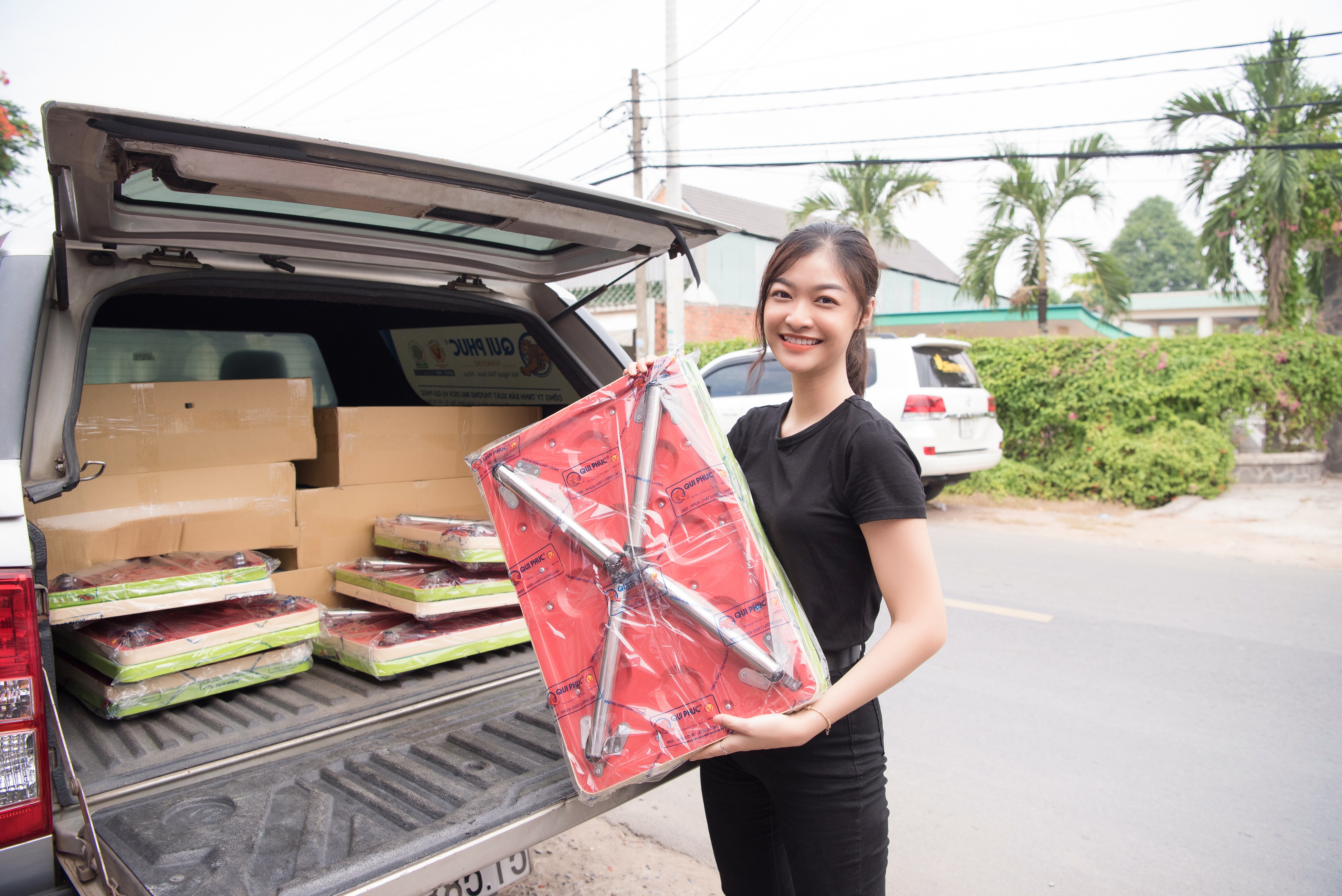 Vượt đường xa, các nàng hậu đã vận chuyển rất nhiều nhu yếu phẩm đến cho mái ấm gồm: nước mắm, trứng, nước suối, mì ăn liền….. Bên cạnh đó, 200 chai gel kháng khuẩn cũng được trao tặng cho các em để bảo vệ sức khỏe cá nhân trong thời điểm bệnh dịch Covid-19 vẫn chưa hoàn toàn được đẩy lùi. Đặc biệt hơn do đa số các em ở mái ấm đều đang ở độ tuổi đi học nên chuyến đi lần này còn mang đến 20 bộ bàn xếp để hỗ trợ các em trong việc sinh hoạt cũng như học tập.