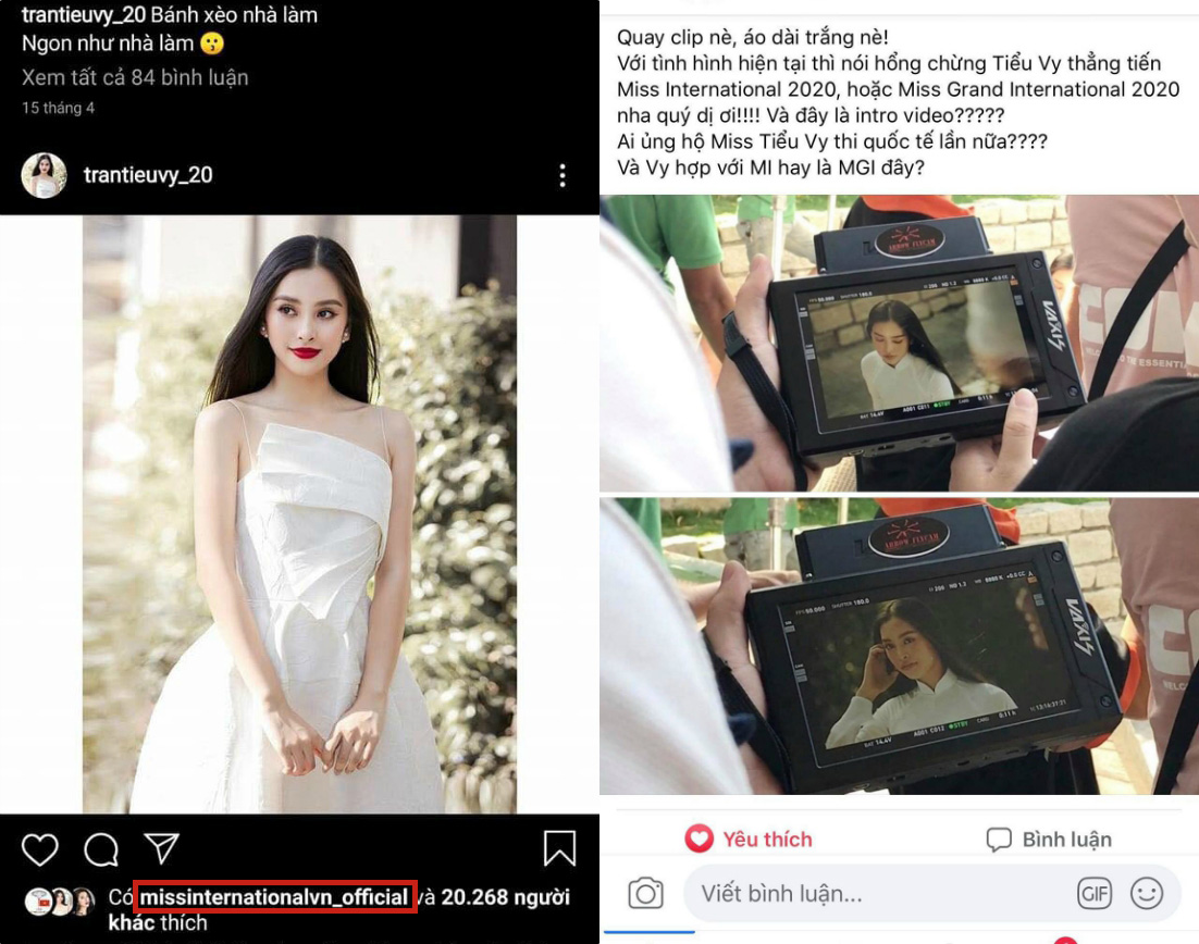 Với hình ảnh hậu trường bị rò rỉ, nhiều fan đặt nghi vấn người đẹp đang cùng ê-kíp quay hình Video Intro cho một cuộc thi quốc tế. Ngay sau đó, fan sắc đẹp nhanh chóng phát hiện tài khoản Instagram của Miss International Vietnam đã có động thái “thả tim” cho Tiểu Vy. Điều này càng khiến người hâm mộ đặt kỳ vọng về cơ hội Tiểu Vy sẽ đại diện Việt Nam tại đấu trường nhan sắc Hoa hậu Quốc tế 2020.