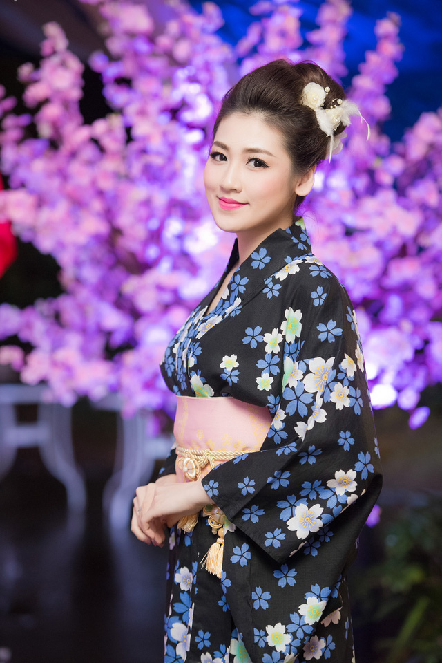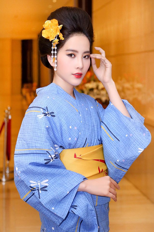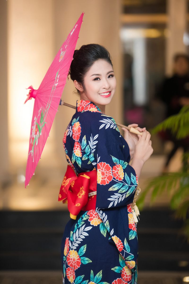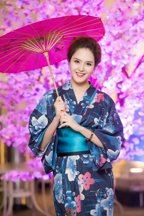 Ngọc Hân nền nã trong bộ trang phục Kimono tông màu xanh chủ đạo. Hoa hậu Ngọc Hân cũng là một trong số những người đẹp Việt rất yêu thích văn hóa và đất nước con người Nhật Bản.