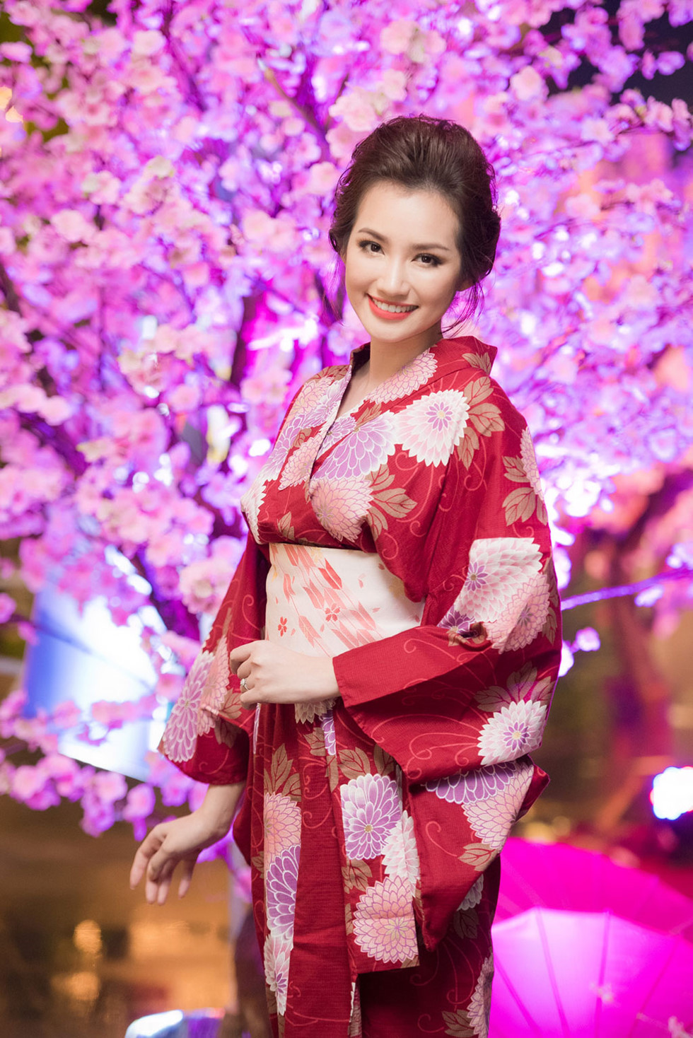 Đỗ Mỹ Linh như một cô gái Nhật Bản đang dạo trên khu phố ngập tràn hoa anh đào. Lối make-up tông màu đỏ đậm phù hợp với tông màu chủ đạo của bộ Kimono.