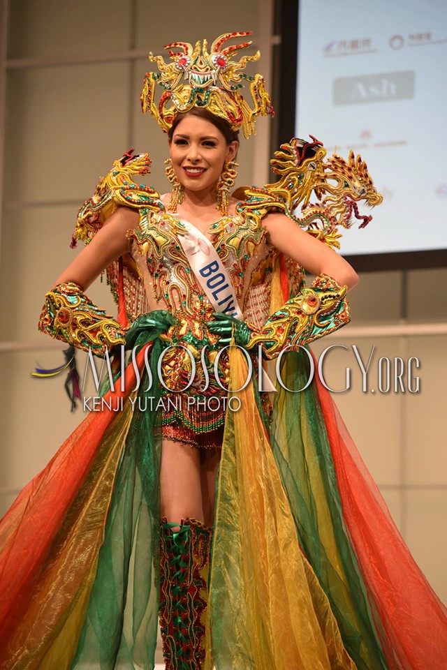 Hoa hậu Bolivia diện trang phục được thiết kế tinh xảo với đầy màu sắc. Phần nón, cầu vai và bao tay được lấy ý tưởng từ hình ảnh linh thú của quốc gia này chế tác thành.