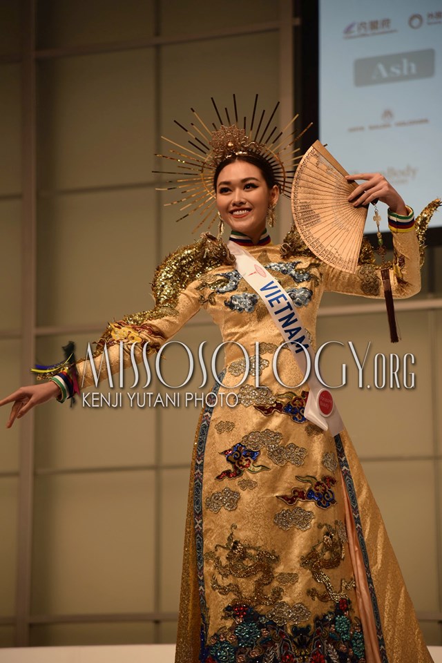Đại diện Việt Nam - Á hậu Tường San đã lựa chọn chiếc áo dài truyền thống được thiết kế cách tân, cầu kì và tinh xảo để mang ra đấu trường nhan sắc quốc tế. Bộ trang phục dân tộc có phần tà dài được dệt kim nổi hình rồng bay phượng múa, kết hợp phần cầu vai 2 bên được được chạm trổ mạ vàng hình rồng đã giúp thể hiện được nét đẹp vừa thanh lịch vừa quyền lực của Tường San.