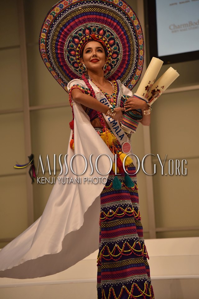 Đại diện Guatemala mang lên sân khấu bộ trang phục dân tộc sặc sỡ sắc màu mà những người phụ nữ của quốc gia mình thường diện trong những dịp tế thần linh quan trọng.