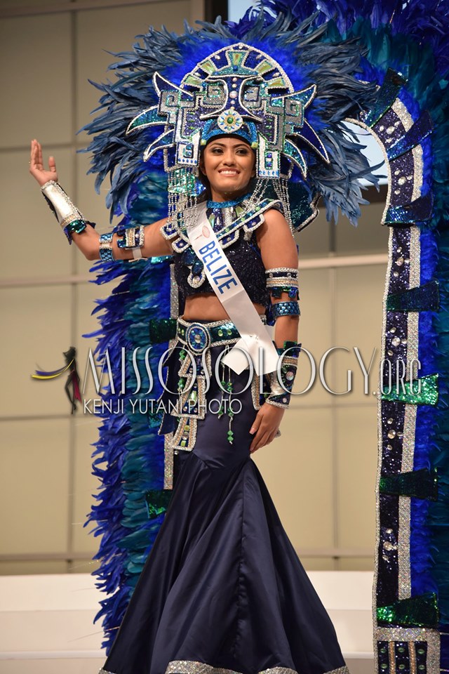 Mỹ nhân Belize diện bộ trang phục cầu kì không kém. Cùng thuộc khu vực với các nước Mỹ Latinh nên văn hoá gần như nhau, nhưng vì quốc gia này giáp biển Ca-ri-bê nên những chiếc lông được nhuộm sang màu xanh và đen để thể hiện sắc màu dân tộc.